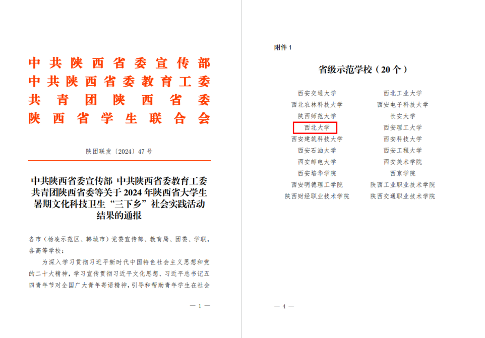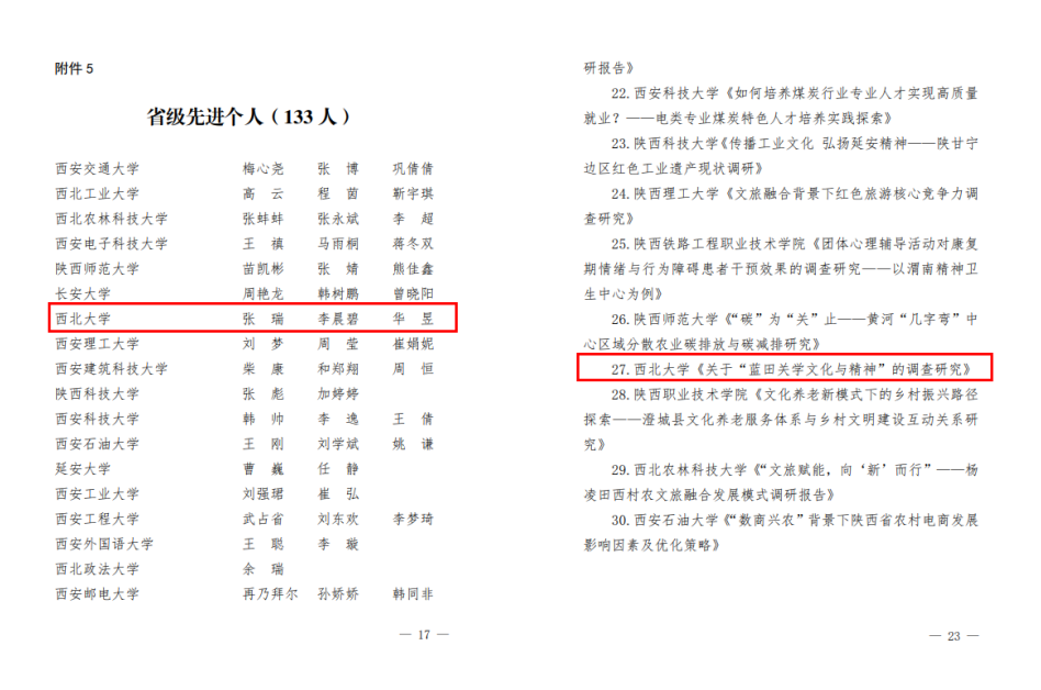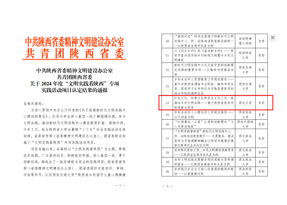 中共陕西省委精神文明建设办公室、共青团陕西省委公布的《关于2024年度“文明实践看陕西”专项实践活动项目认定结果的通报》中,开云(中国)《红色文化、知青文化和农业文化三位一体开云网页版登录入口良好推动乡村文明实践——基于陕西省延安市的观察与思考》项目获得“良好”认定结果。