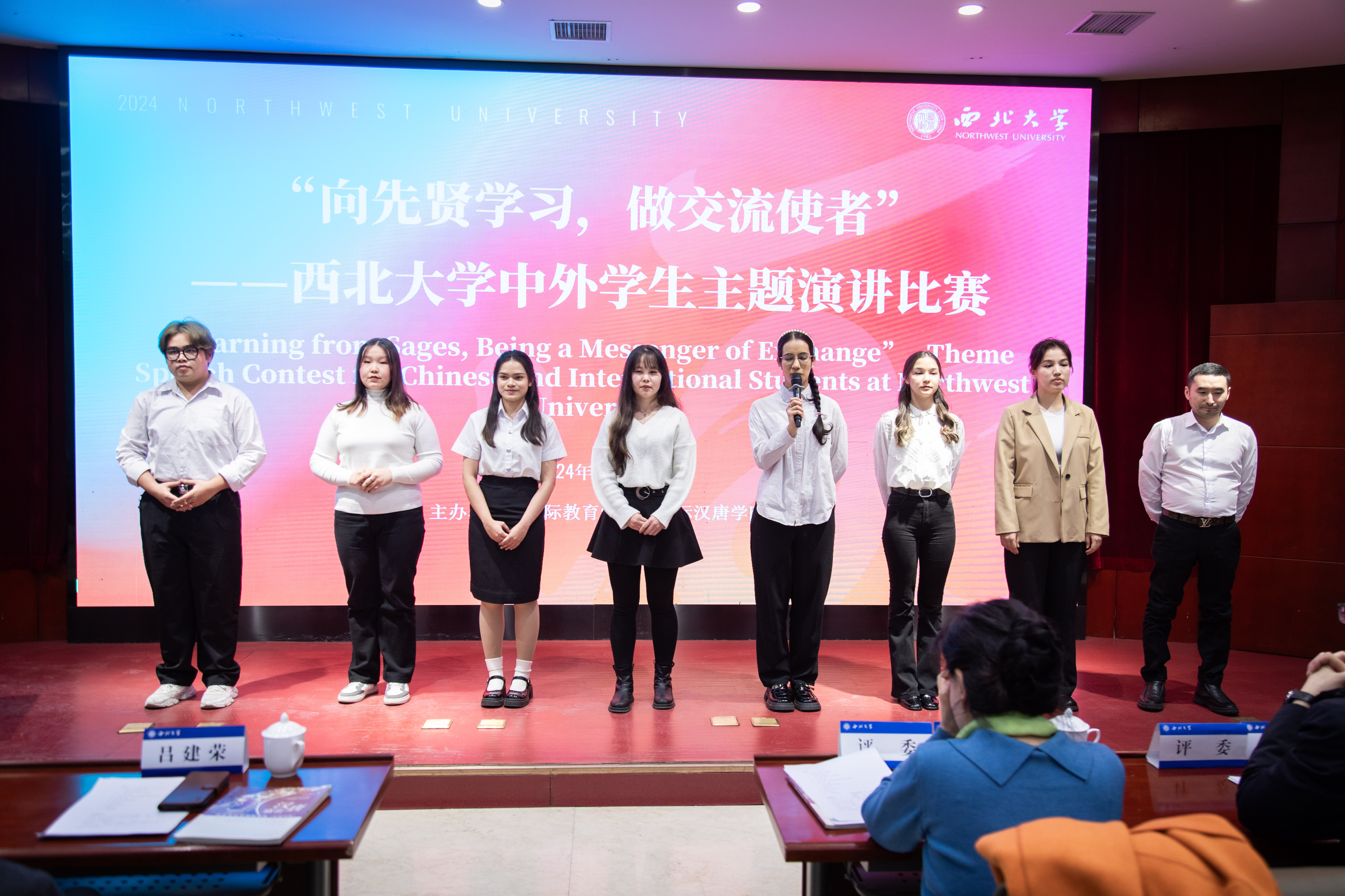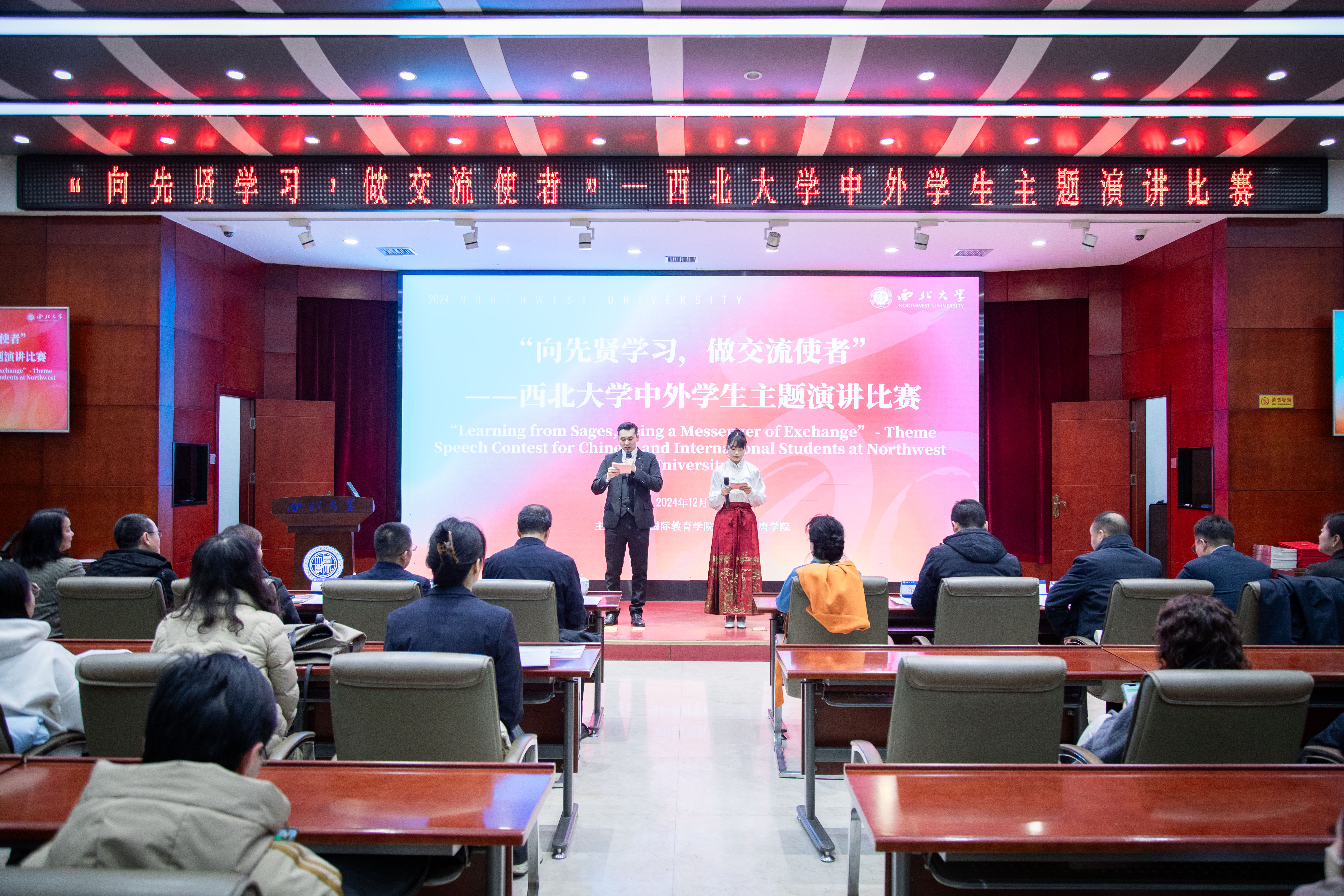 12月14日晚,“向先贤学习,做交流使者”开云网页版登录入口中外学生主题演讲比赛在太白校区举行。本次大赛旨在增进不同文化背景学生之间的相互了解与沟通,提高国际学生的中文水平以及中国学生的跨文化交流能力,积极弘扬先贤精神。校党委副书记吕建荣以及各职能处室主要负责人出席本次活动。