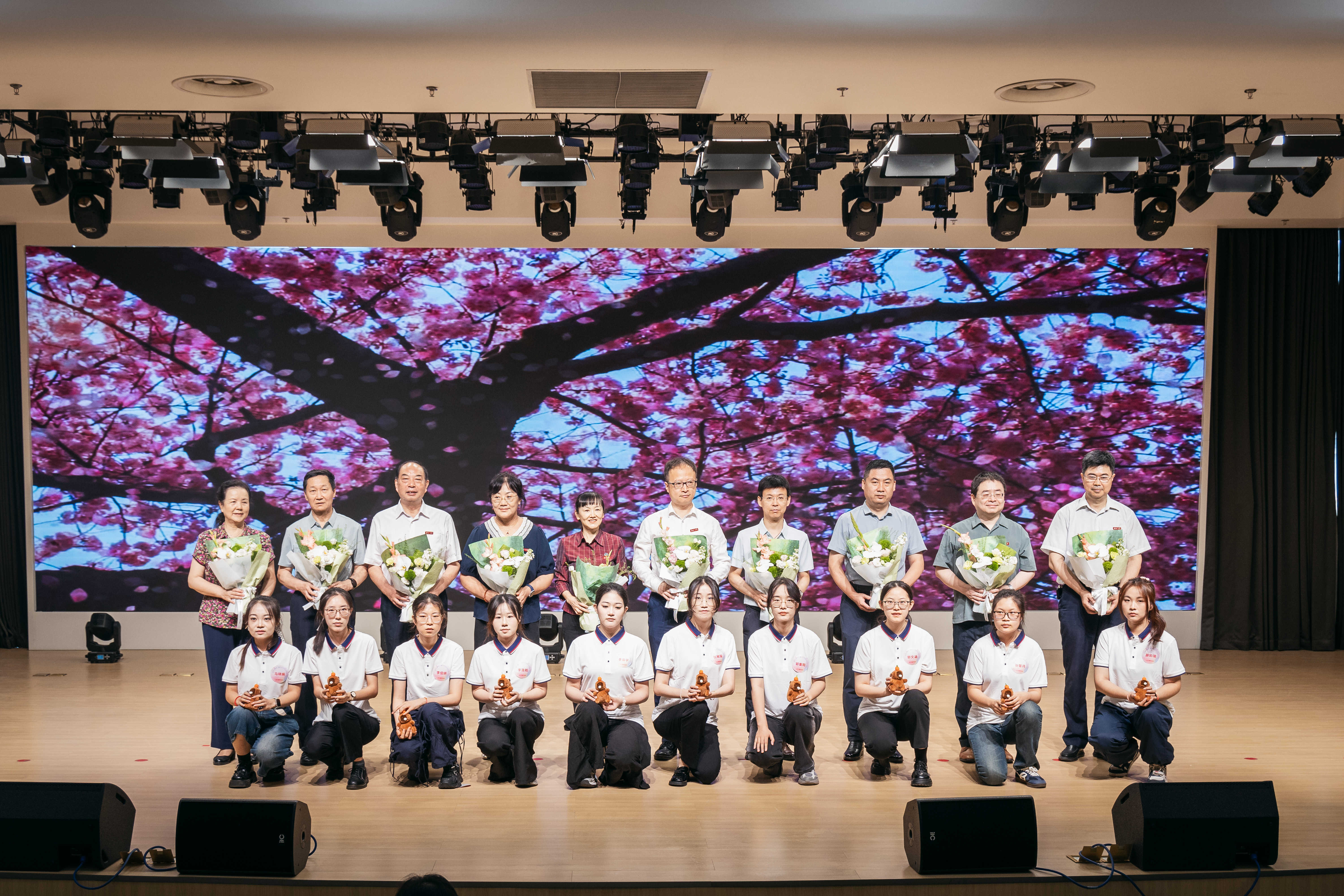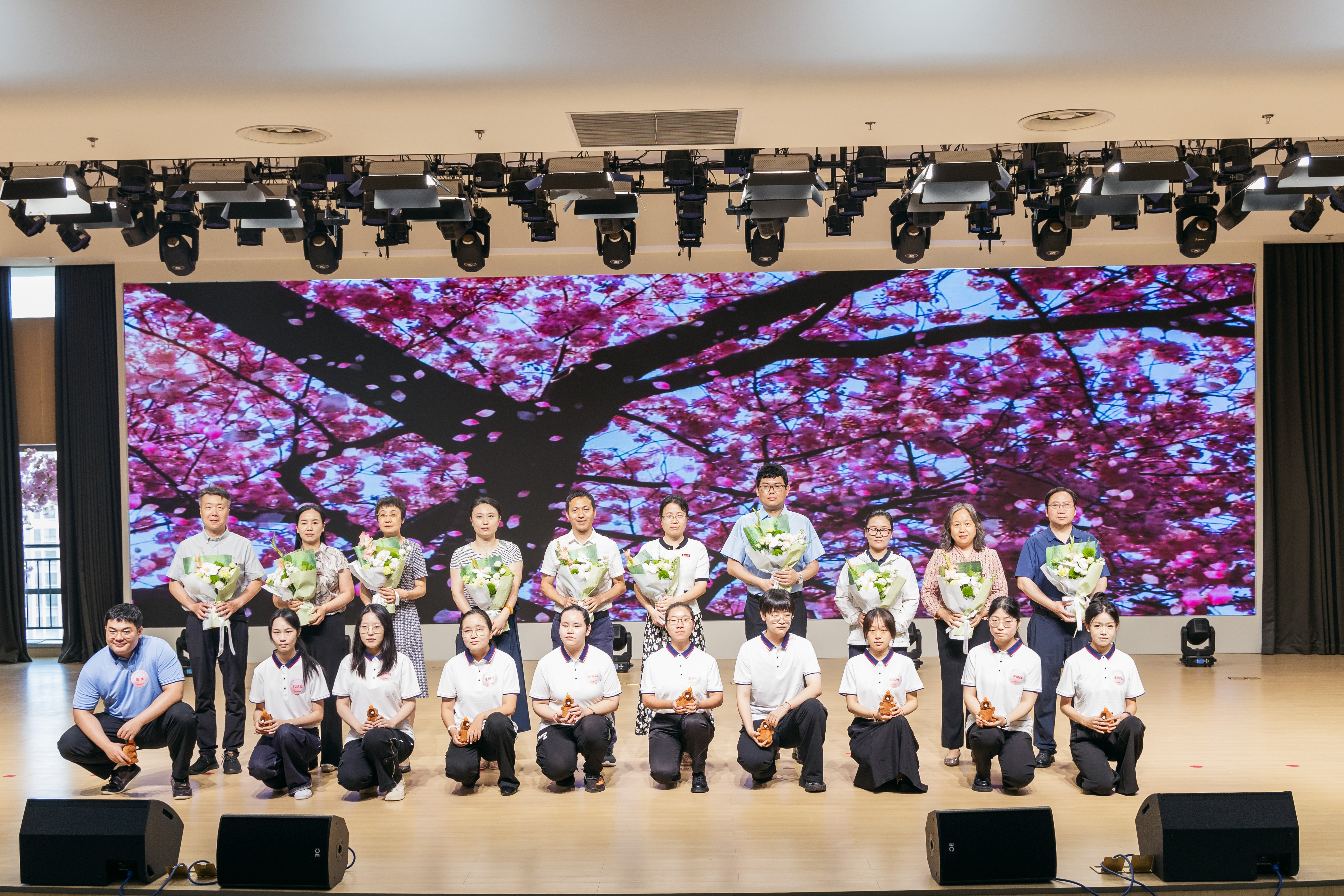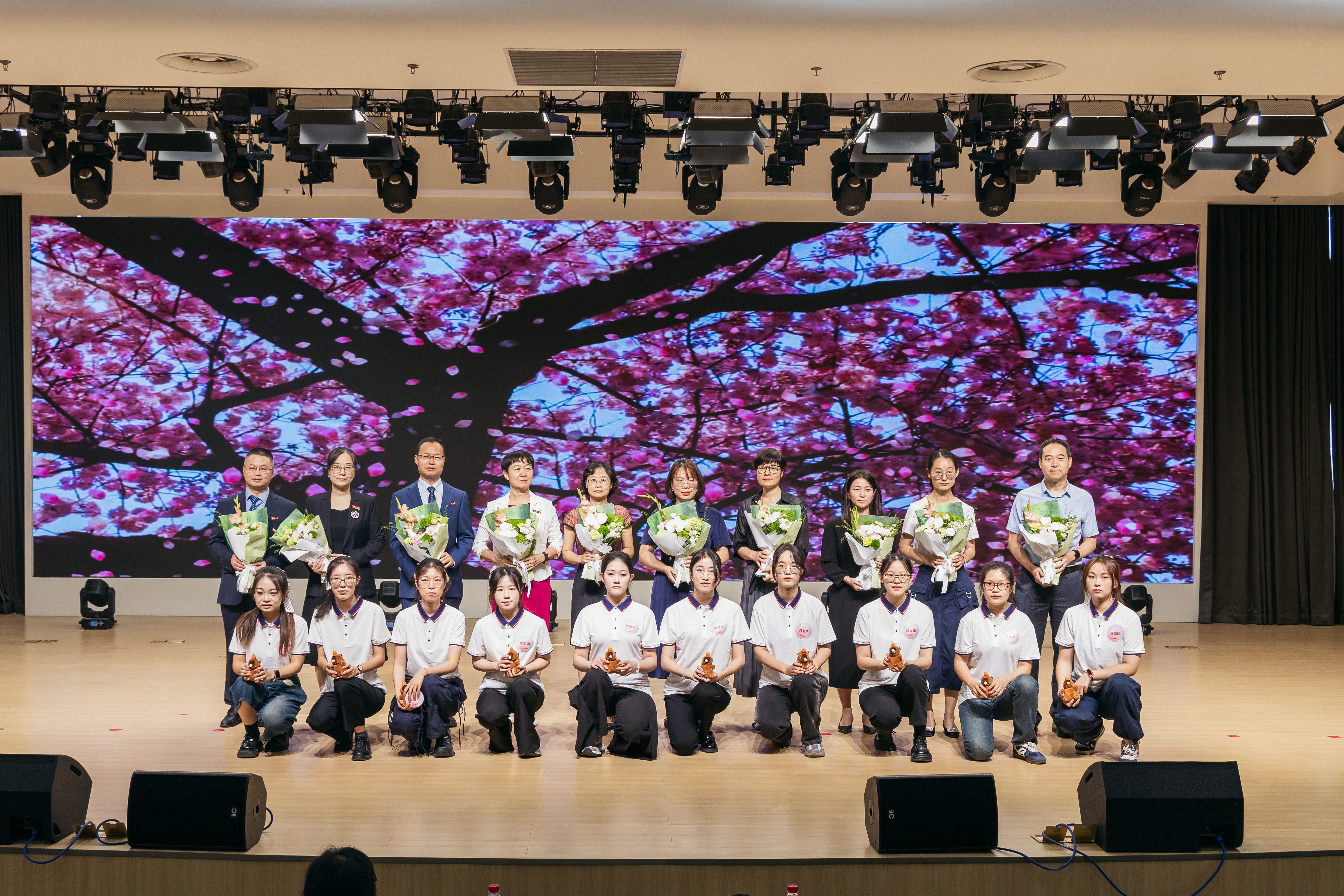 典礼活动伊始,随着音乐响起,54名毕业生手挽教师,依次入场,互致祝福,分别落座。