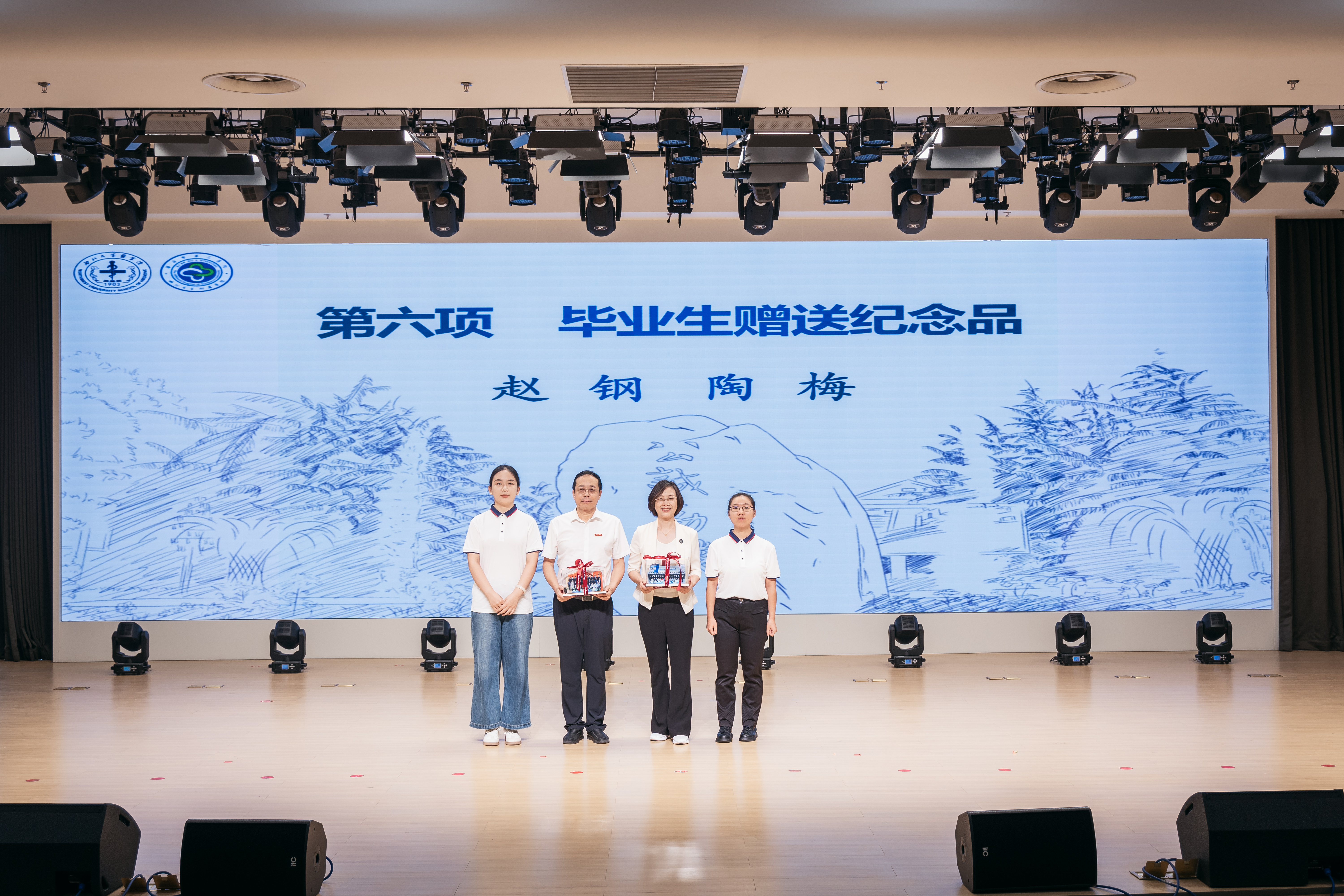 毕业分别之际,毕业生同学收集了他们的课堂笔记、解剖绘图作品以及班级集体照精心制作成纪念品,献予学校。赵钢、陶梅代表医学院、附属医院接受赠送。
