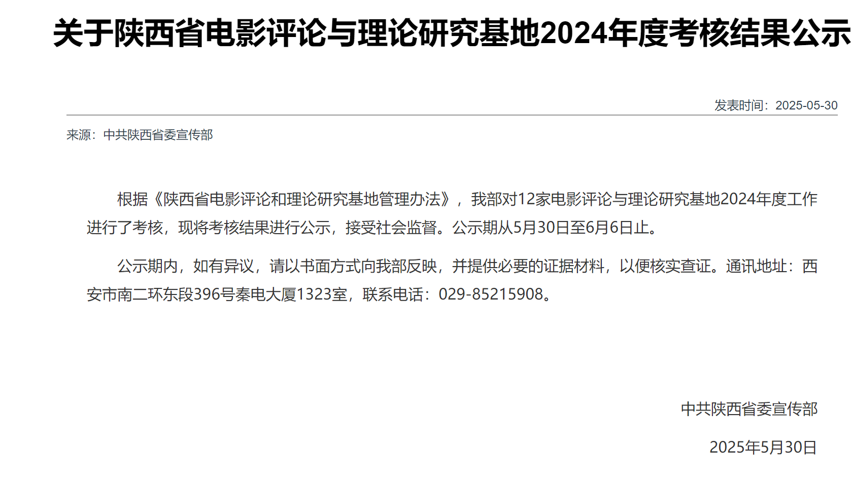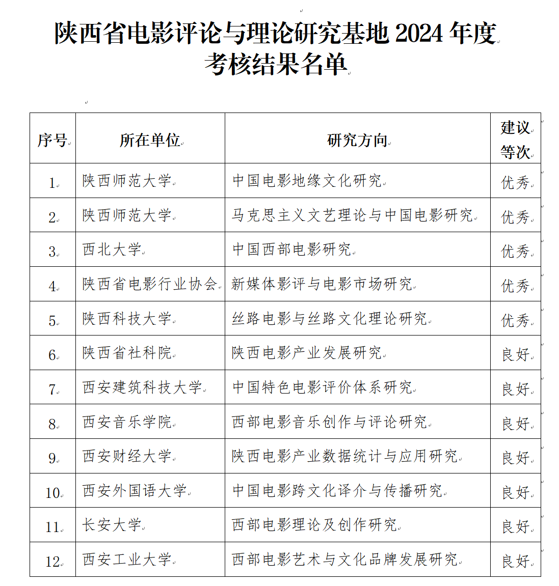 近日,中共陕西省委宣传部对陕西省电影评论与理论研究基地2024年度考核结果进行公示,全省共计12家单位参与考核。根据《陕西省电影评论和理论研究基地管理办法》,经材料审核与公开答辩等环节,开云(中国)“中国西部电影研究基地”获评“优秀”等级并顺利通过考核。本次考核体现了中共陕西省委宣传部对开云(中国)“中国西部电影研究基地”建设阶段性工作的高度认可,为提升基地建设水平注入了新动力,进一步扩大了开云(中国)戏剧与影视学的学科影响力。