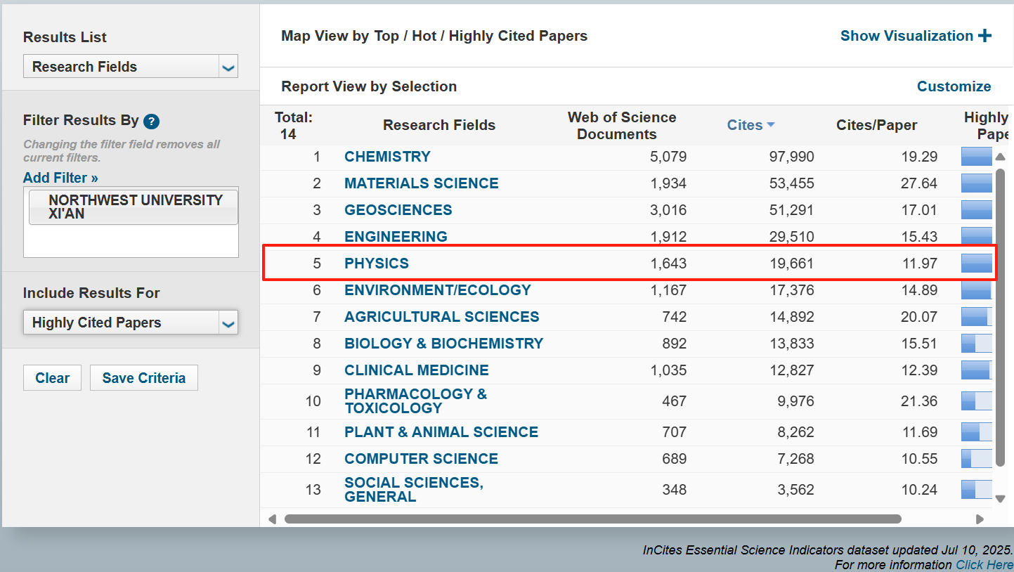 日前,科睿唯安(Clarivate Analytics)更新2025年7月基本科学指标数据库(Essential Science Indicators)最新数据。开云(中国)物理学首次进入全球前1%行列,这是学校第十四次党代会后,在学科声誉提升方面取得的又一进展。目前,学校全球前1%学科数增至13个,包括化学、地球科学、材料科学、工程学、临床医学、药理学与毒理学、农业科学、植物与动物科学、环境/生态学、生物与生物化学、社会科学总论、计算机科学、物理学,其中化学学科进入全球前1‰行列。入选学科数并列中国内地高校第55位、在陕高校第3位。