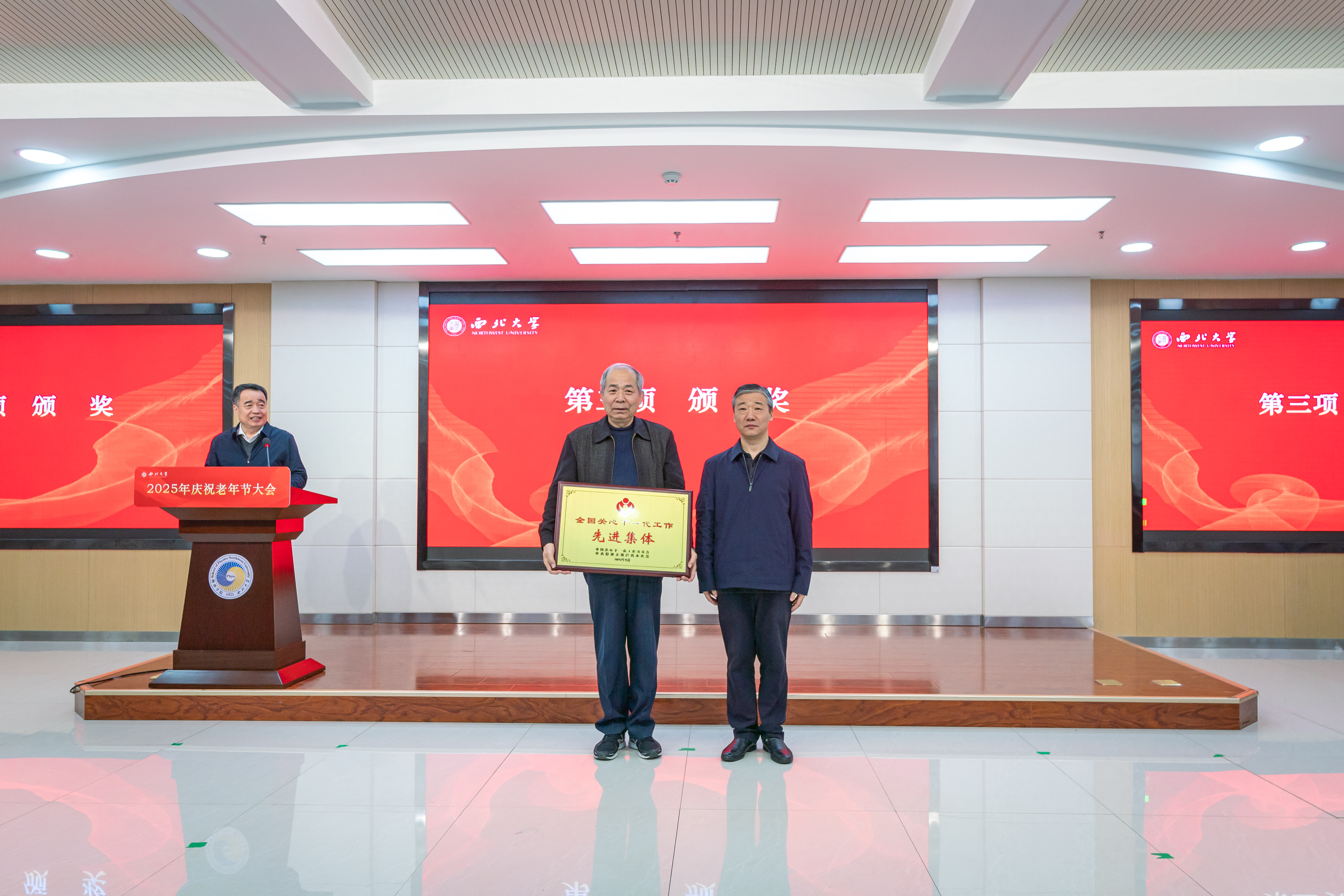 董国强宣读了2025年年满70、80及90周岁的退休教职工名单。蒋林、董国强共同为当天到会的70、80周岁老同志代表发放祝寿金,表达学校对老同志们的祝福和敬意。