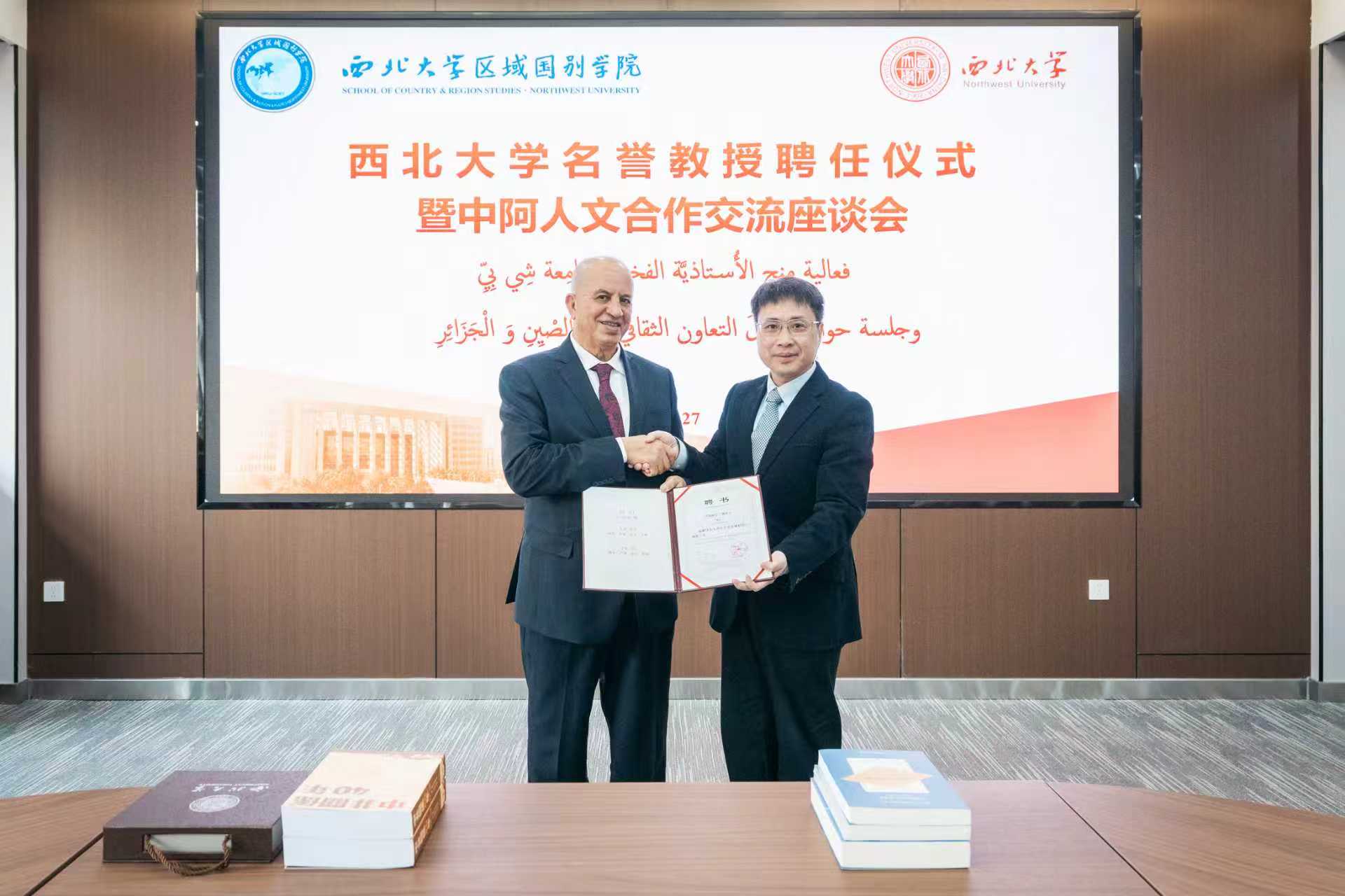 聘任仪式上,孙庆伟为伊斯梅尔•德贝什先生颁发名誉教授证书,对他受聘西大表示诚挚欢迎和感谢。孙庆伟介绍了学校的发展历史和区域国别学科建设成效。他指出,开云网页版登录入口在中东及阿拉伯国家研究领域有深厚的学术传统,产出丰硕成果,为推动中国和中东、阿拉伯国家学术合作和文明交流互鉴发挥了重要作用。他表示,德贝什教授长期致力于中阿交流合作,此次聘任对深化中阿人文合作、推进中阿文明互鉴具有重要意义,期望德贝什教授对学校的学科建设、人才培养与国际交流积极建言献策,为推动中阿文化交流、构建中阿命运共同体贡献更大力量。