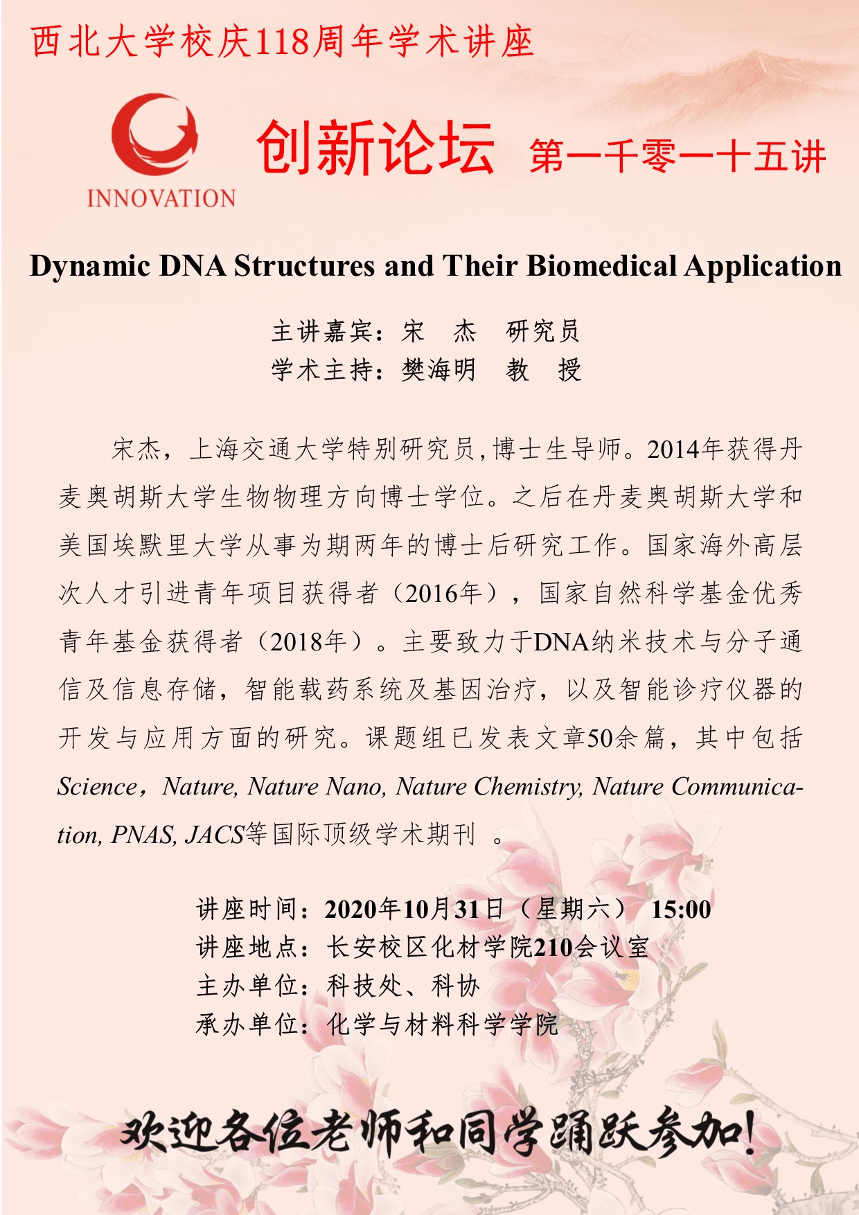 宋杰 研究员 开云网页版登录入口创新论坛第一千零一十五讲暨校庆118周年学术讲座:Dynamic DNA Structures and Their Biomedical Application 讲座时间 2020年10月31日(星期六)15:00 讲座地点 化学与材料科学学院210室 讲座人介绍 宋杰 研究员 讲座内容