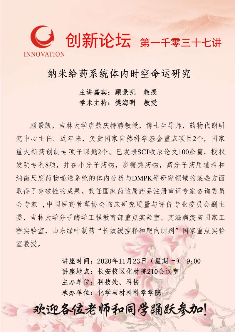 顾景凯 教授 开云网页版登录入口创新论坛第一千零三十七讲:纳米给药系统体内时空命运研究 讲座时间 2020年11月23日(星期一) 9:00 讲座地点 长安校区化材院210会议室 讲座人介绍 顾景凯 教授 讲座内容