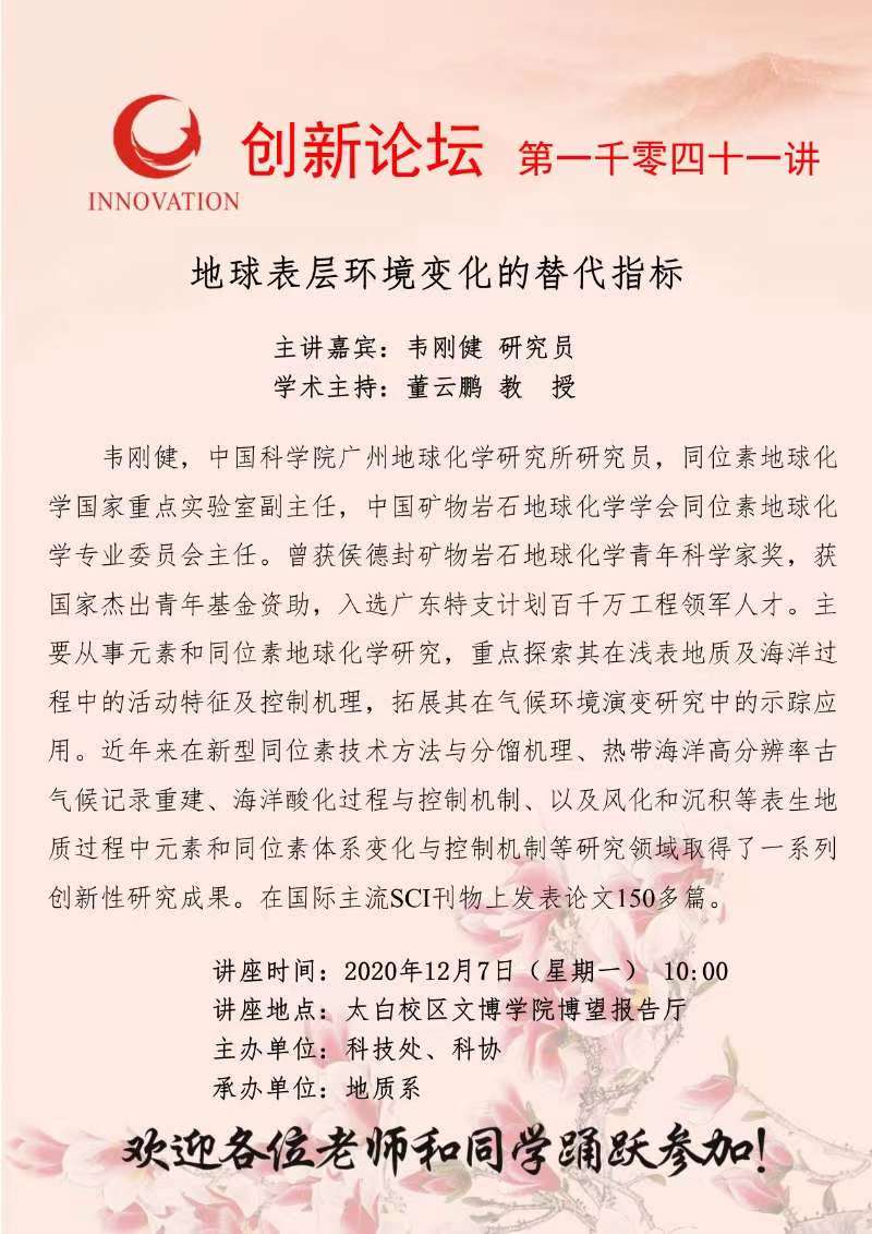 韦刚健 研究员 开云网页版登录入口创新论坛第一千零四十一讲:地球表层环境变化的替代指标 讲座时间 2020年12月7日(星期一) 10:00 讲座地点 太白校区文博学院博望报告厅 讲座人介绍 韦刚健 研究员 讲座内容