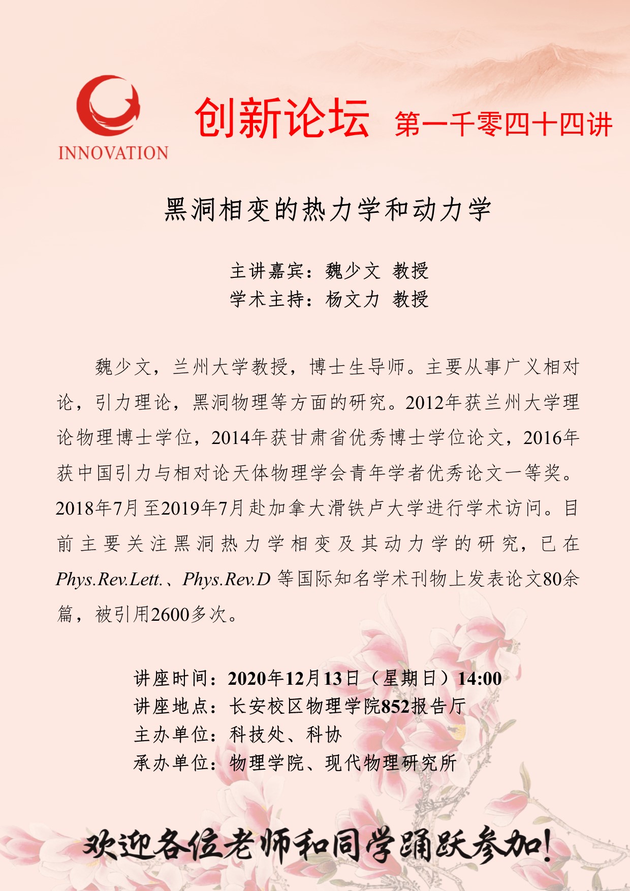 魏少文 教授 开云网页版登录入口创新论坛第一千零四十四讲:黑洞相变的热力学和动力学 讲座时间 2020年12月13日(星期日)14:00 讲座地点 长安校区物理学院852报告厅 讲座人介绍 魏少文 教授 讲座内容