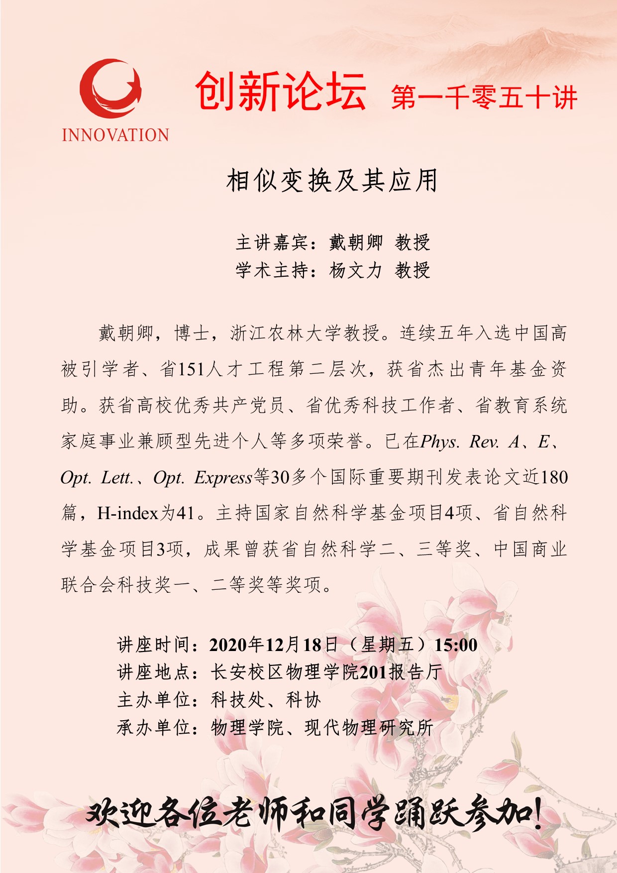 戴朝卿 教授 开云网页版登录入口创新论坛第一千零五十讲:相似变换及其应用 讲座时间 2020年12月18日(星期五)15:00 讲座地点 长安校区物理学院201报告厅 讲座人介绍 戴朝卿 教授 讲座内容