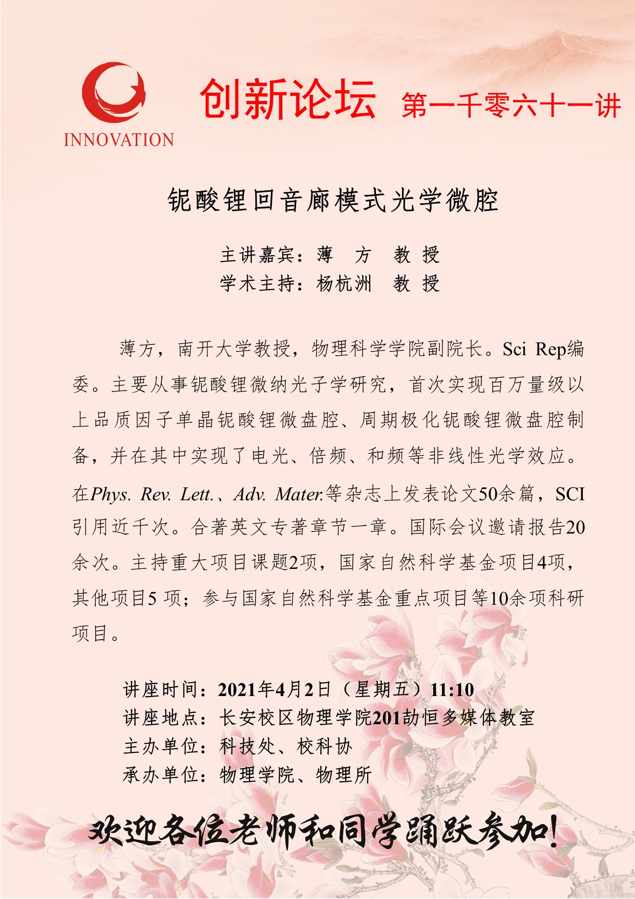 薄 方 教 授 开云网页版登录入口创新论坛第一千零六十一讲:铌酸锂回音廊模式光学微腔 讲座时间 2021年4月2日(星期五)11:10 讲座地点 长安校区物理学院201劼恒多媒体教室 讲座人介绍 薄 方 教 授 讲座内容