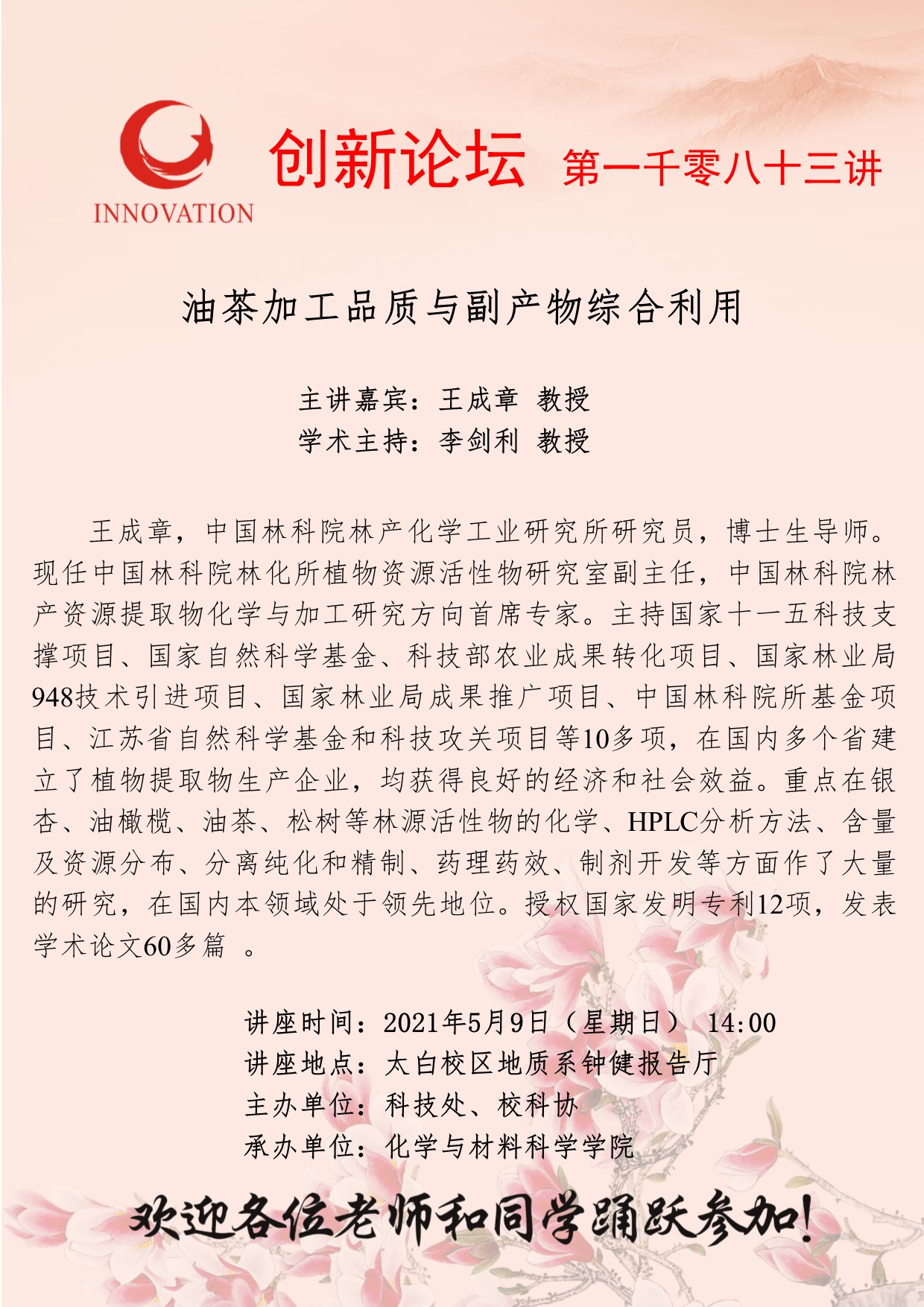 王成章 教授 开云网页版登录入口创新论坛第一千零八十三讲:油茶加工品质与副产物综合利用 讲座时间 2021年5月9日(星期日) 14:00 讲座地点 太白校区地质系钟健报告厅 讲座人介绍 王成章 教授 讲座内容