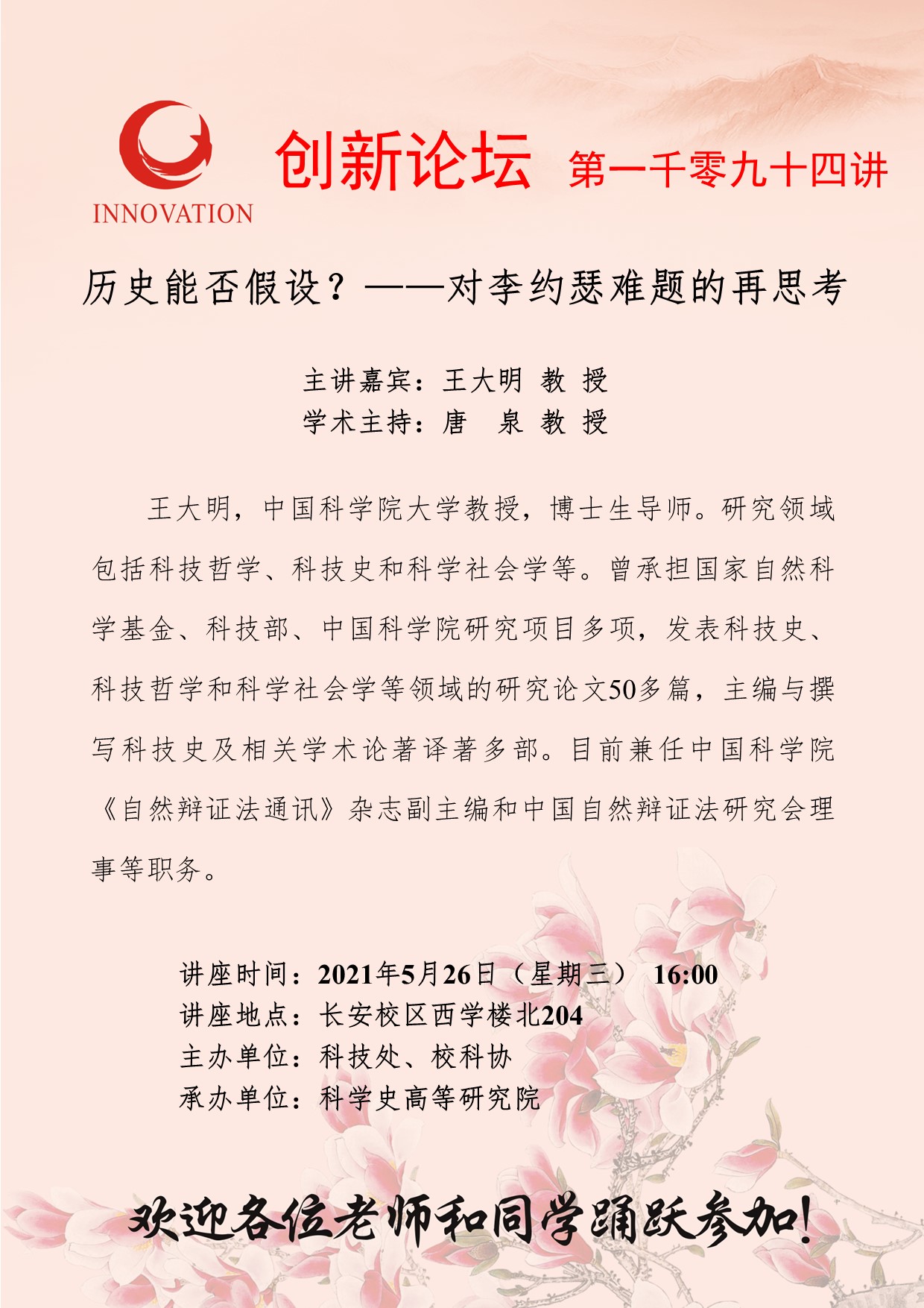 王大明 教 授 开云网页版登录入口创新论坛第一千零九十四讲:历史能否假设?——对李约瑟难题的再思考 讲座时间 2021年5月26日(星期三) 16:00 讲座地点 长安校区西学楼北204 讲座人介绍 王大明 教 授 讲座内容