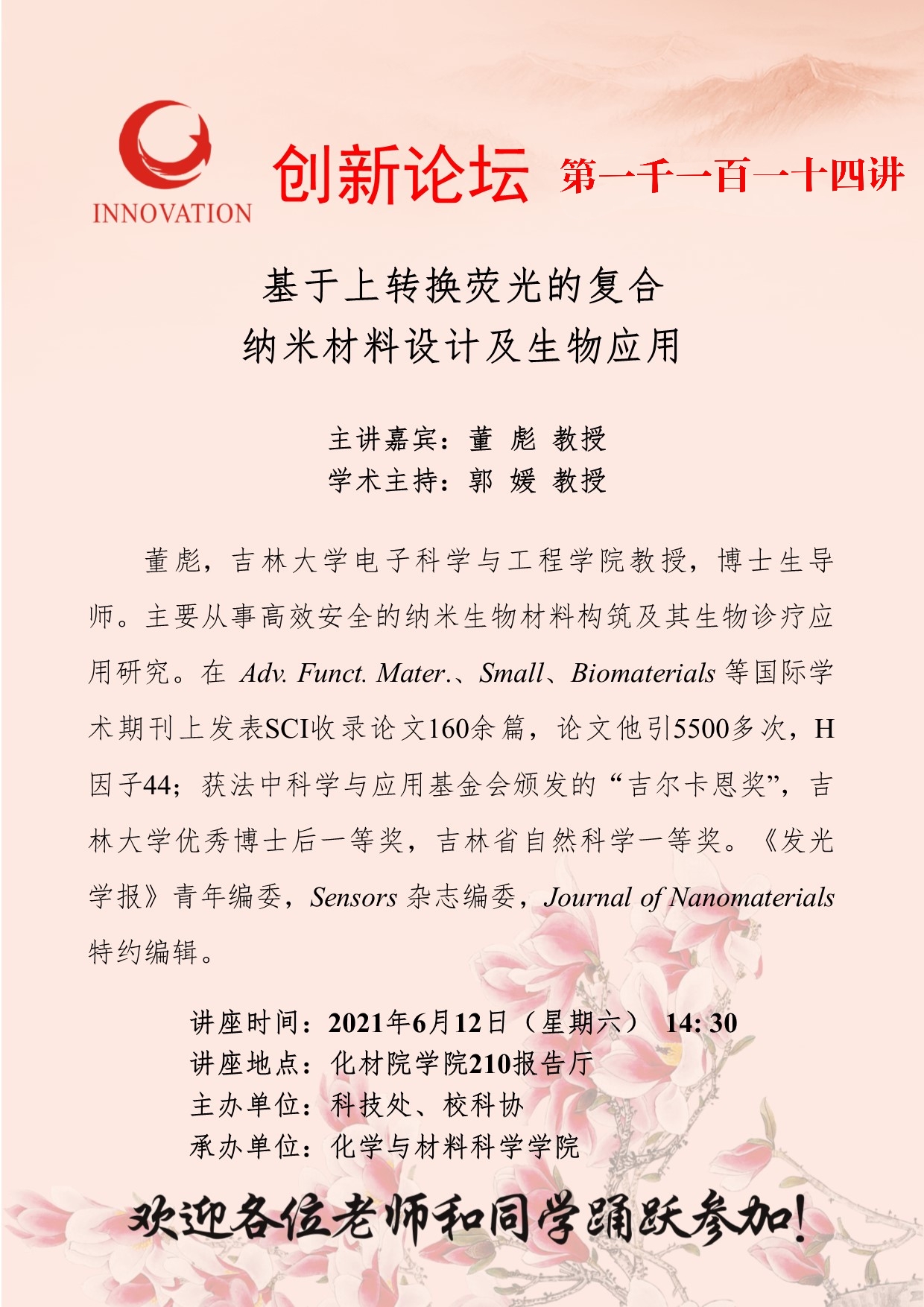 董彪 教授 开云网页版登录入口创新论坛第一千一百一十四讲:基于上转换荧光的复合纳米材料设计及生物应用 讲座时间 2021年6月12日(星期六) 14: 30 讲座地点 化材学院210报告厅 讲座人介绍 董彪 教授 讲座内容