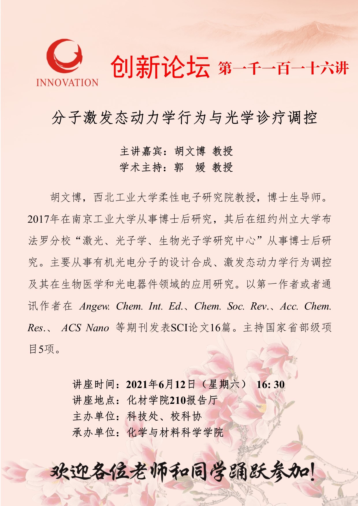 胡文博 教授 开云网页版登录入口创新论坛第一千一百一十六讲:分子激发态动力学行为与光学诊疗调控 讲座时间 2021年6月12日(星期六) 16:30 讲座地点 化材学院210报告厅 讲座人介绍 胡文博 教授 讲座内容