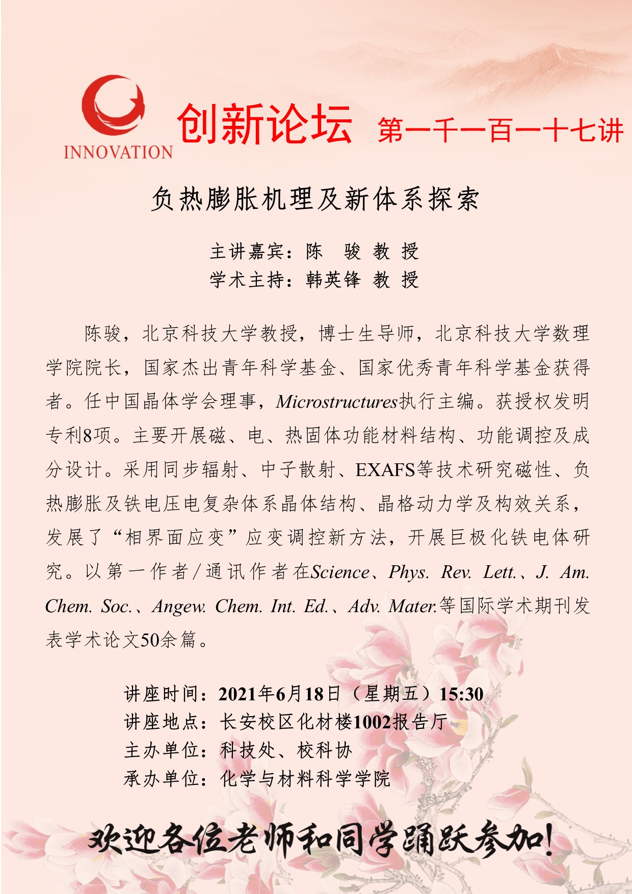 陈骏 教授 开云网页版登录入口创新论坛第一千一百一十七讲:负热膨胀机理及新体系探索 讲座时间 2021年6月18日(星期五)15:30 讲座地点 长安校区化材楼1002报告厅 讲座人介绍 陈骏 教授 讲座内容