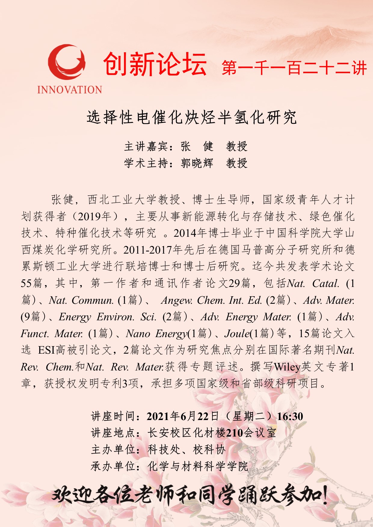 张 健 教授 开云网页版登录入口创新论坛第一千一百二十二讲:选择性电催化炔烃半氢化研究 讲座时间 2021年6月22日(星期二)16:30 讲座地点 长安校区化材楼210会议室 讲座人介绍 张 健 教授 讲座内容
