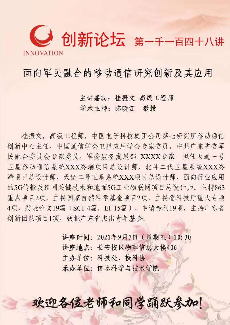 桂振文 高级工程师 开云网页版登录入口创新论坛第一千一百四十八讲:面向军民融合的移动通信研究创新及其应用 讲座时间 2021年9月3日(星期五)10:30 讲座地点 长安校区物理信息大楼406 讲座人介绍 桂振文 高级工程师 讲座内容