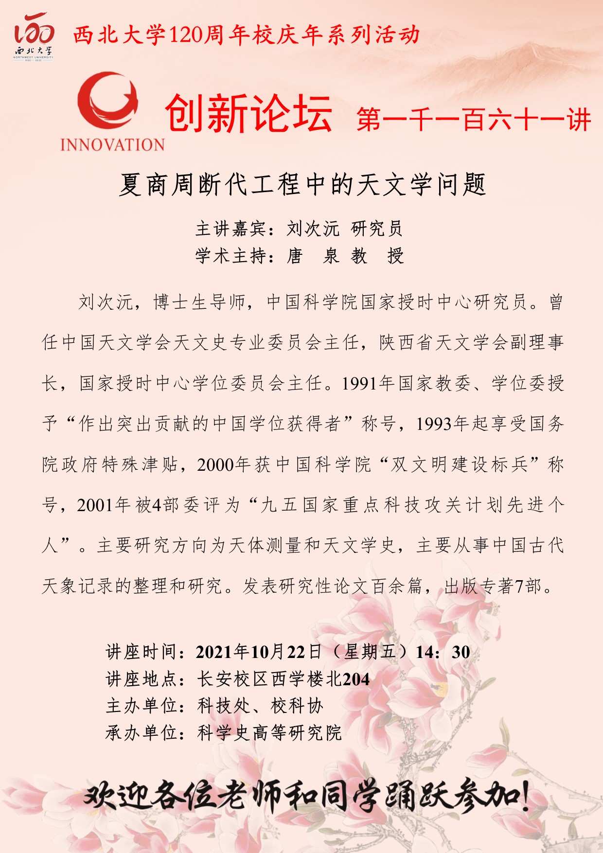 刘次沅 研究员 开云网页版登录入口创新论坛第一千一百六十一讲暨120周年校庆年系列活动:夏商周断代工程中的天文学问题 讲座时间 2021年10月22日(星期五)14:30 讲座地点 长安校区西学楼北204 讲座人介绍 刘次沅 研究员 讲座内容