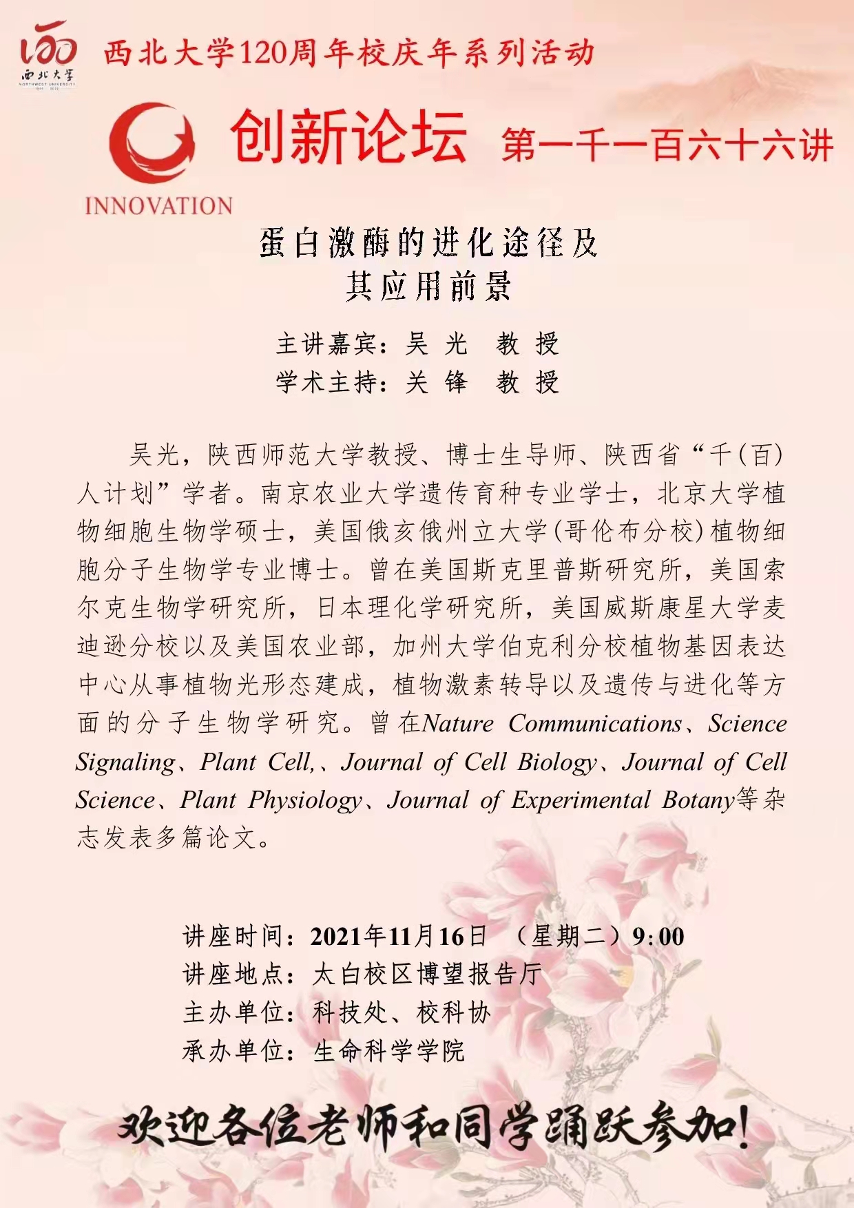 吴光 教授 开云网页版登录入口创新论坛第一千一百六十六讲暨120周年校庆年系列活动:蛋白激酶的进化途径及其应用前景 讲座时间 2021年11月16日 (星期二)9:00 讲座地点 太白校区博望报告厅 讲座人介绍 吴光 教授 讲座内容