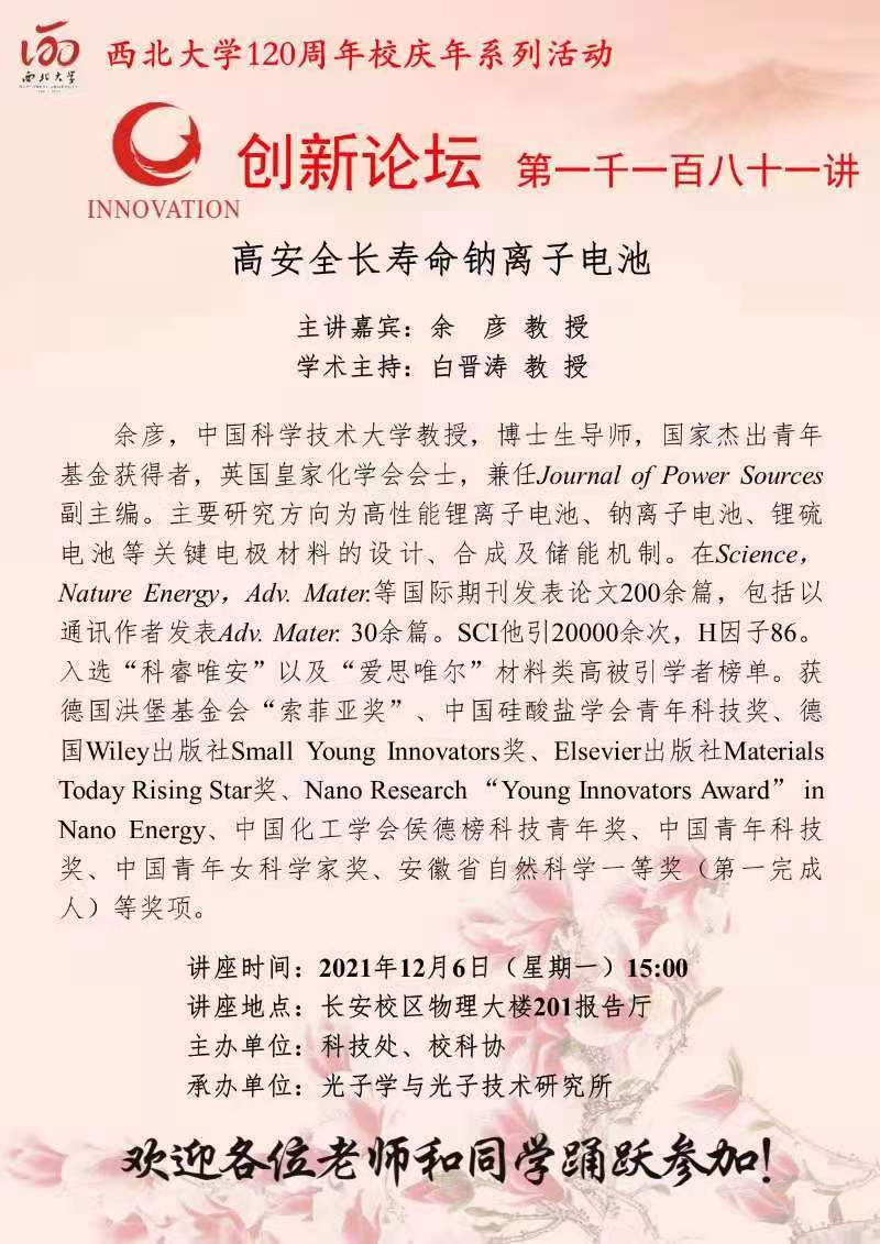 余彦 教授 开云网页版登录入口创新论坛第一千一百八十一讲暨120周年校庆年系列活动:高安全长寿命钠离子电池 讲座时间 2021年12月6日(星期一)15:00 讲座地点 长安校区物理大楼201报告厅 讲座人介绍 余彦 教授 讲座内容