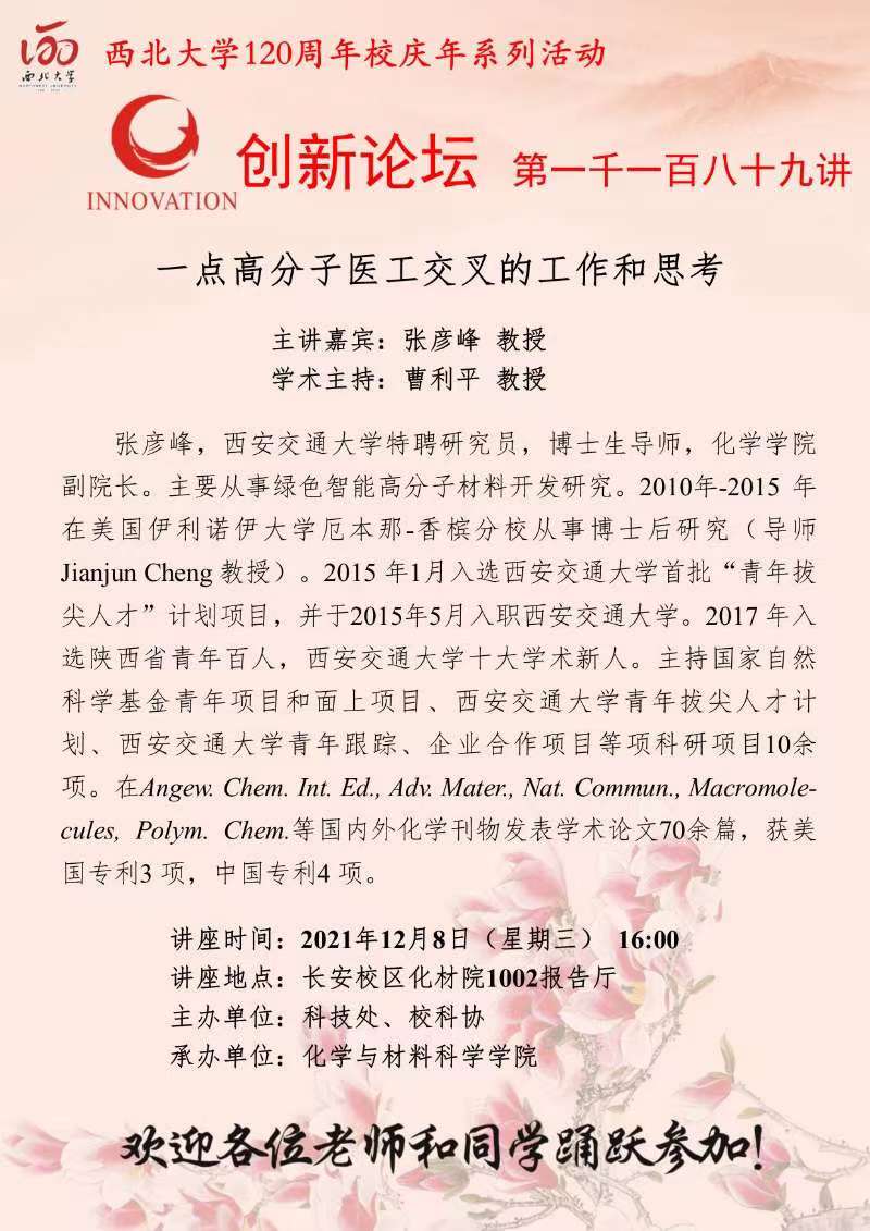 张彦峰 教授 开云网页版登录入口创新论坛第一千一百八十九讲暨120周年校庆年系列活动:一点高分子医工交叉的工作和思考 讲座时间 2021年12月8日(星期三) 16:00 讲座地点 长安校区化材院1002报告厅 讲座人介绍 张彦峰 教授 讲座内容