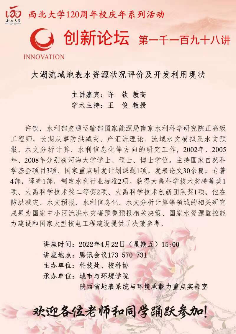 许钦 教高 开云网页版登录入口创新论坛第一千一百九十八讲暨120周年校庆年系列活动:太湖流域地表水资源状况评价及开发利用现状 讲座时间 2022年4月22日(星期五)15:00 讲座地点 腾讯会议:173 570 731 讲座人介绍 许钦 教高 讲座内容