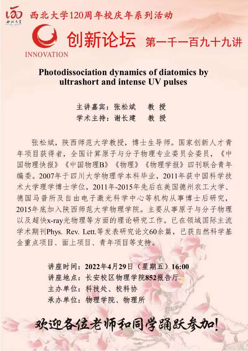 张松斌 教授 开云网页版登录入口创新论坛第一千一百九十九讲暨120周年校庆年系列活动:Photodissociation dynamics of diatomics by ultrashort and intense UV pulses 讲座时间 2022年4月29日(星期五)16:00 讲座地点 长安校区物理学院852报告厅 讲座人介绍 张松斌 教授 讲座内容