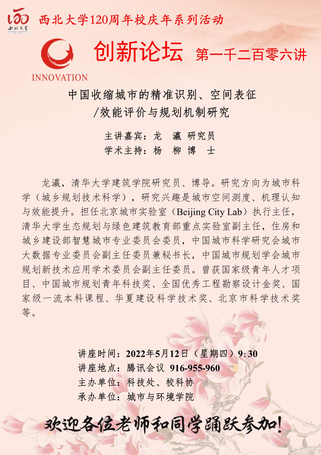 龙瀛 研究员 开云网页版登录入口创新论坛第一千二百零六讲暨120周年校庆年系列活动:中国收缩城市的精准识别、空间表征/效能评价与规划机制研究 讲座时间 2022年5月12日(星期四)9:30 讲座地点 腾讯会议:916-955-960 讲座人介绍 龙瀛 研究员 讲座内容