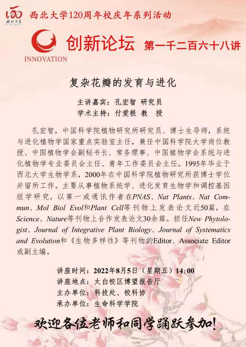 孔宏智 研究员 开云网页版登录入口创新论坛第一千二百六十八讲暨120周年校庆年系列活动:复杂花瓣的发育与进化 讲座时间 2022年8月5日(星期五)14:00 讲座地点 太白校区博望报告厅 讲座人介绍 孔宏智 研究员 讲座内容