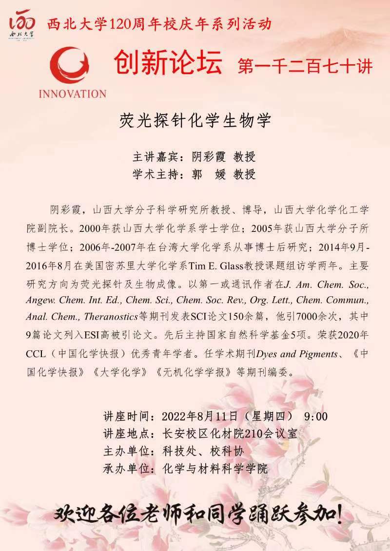 阴彩霞 教授 开云网页版登录入口创新论坛第一千二百七十讲暨120周年校庆年系列活动:荧光探针化学生物学 讲座时间 2022年8月11日(星期四) 9:00 讲座地点 长安校区化材院210会议室 讲座人介绍 阴彩霞 教授 讲座内容