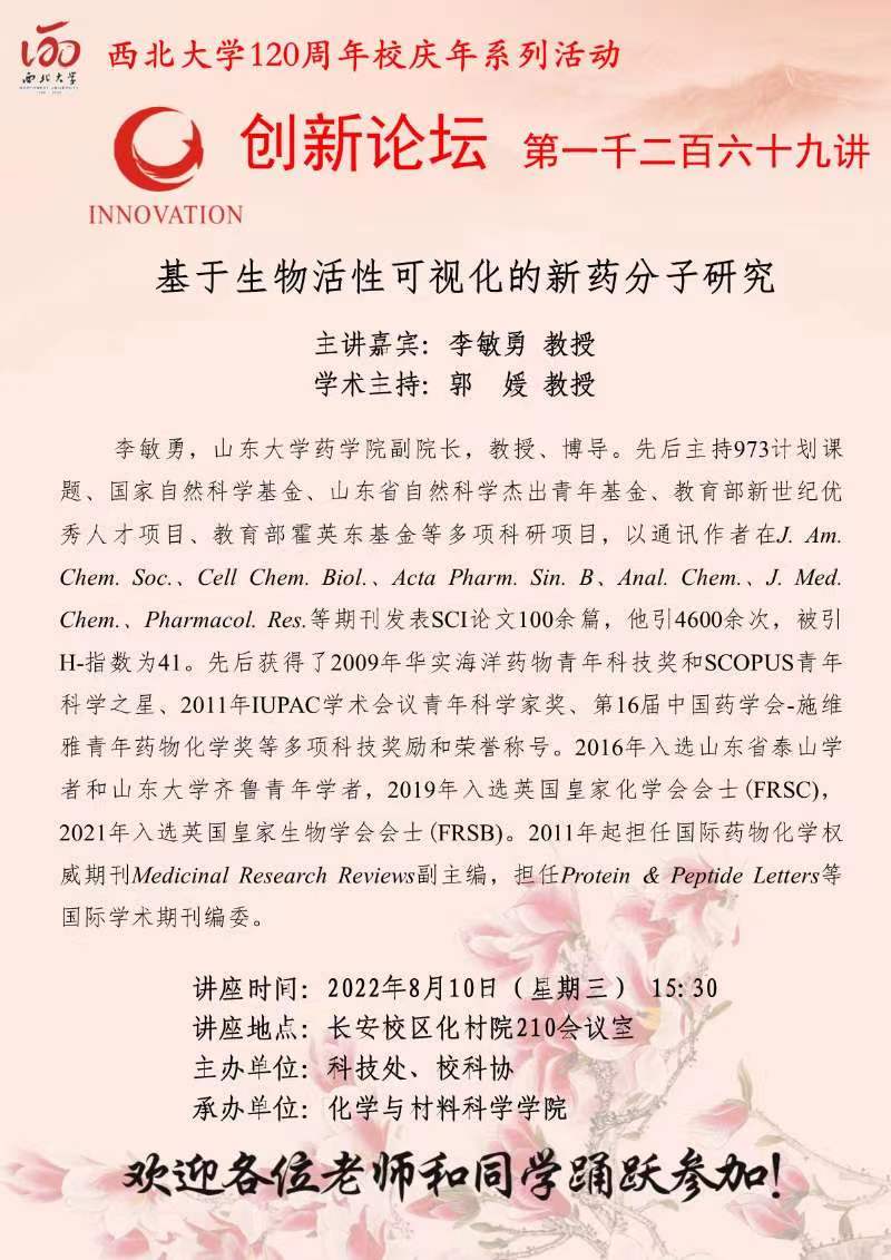 李敏勇 教授 开云网页版登录入口创新论坛第一千二百六十九讲暨120周年校庆年系列活动:基于生物活性可视化的新药分子研究 讲座时间 2022年8月10日(星期三) 15:30 讲座地点 长安校区化材院210会议室 讲座人介绍 李敏勇 教授 讲座内容