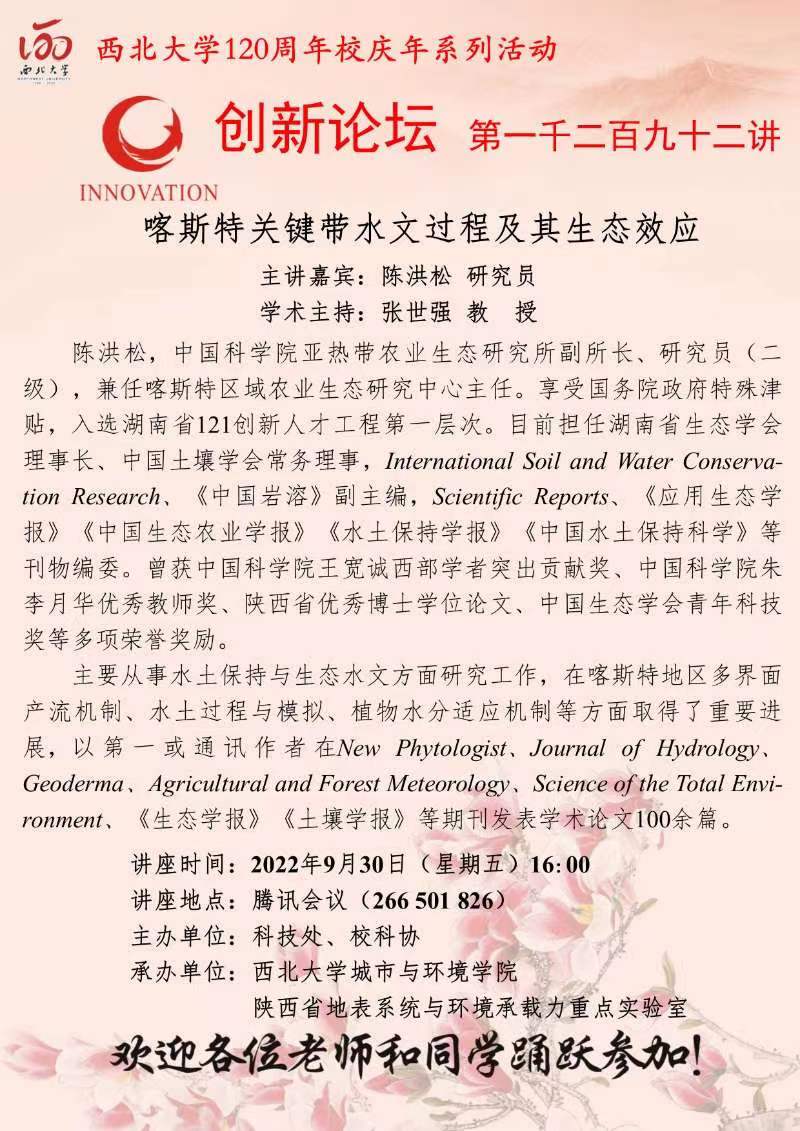 陈洪松 教授 开云网页版登录入口创新论坛第一千二百九十二讲暨120周年校庆年系列活动: 喀斯特关键带水文过程及其生态效应 讲座时间 2022年9月30日(星期五) 16:00 讲座地点 腾讯会议 266 501 826 讲座人介绍 陈洪松 教授 讲座内容