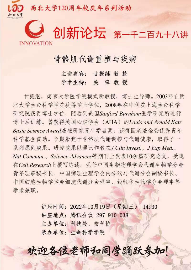 甘振继 教授 开云网页版登录入口创新论坛第一千二百九十八讲暨120周年校庆年系列活动: 骨骼肌代谢重塑与疾病 讲座时间 2022年10月19日(星期三) 14:30 讲座地点 腾讯会议 297 910 038 讲座人介绍 甘振继 教授 讲座内容