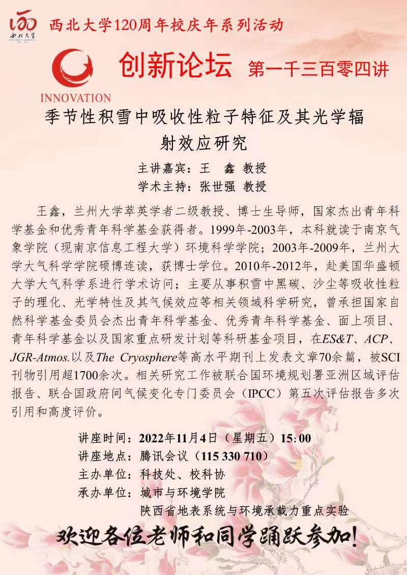 王 鑫 教授 开云网页版登录入口创新论坛第一千三百零四讲暨120周年校庆年系列活动: 季节性积雪中吸收性粒子特征及其光学辐射效应研究 讲座时间 2022年11月4日(星期五)15:00 讲座地点 腾讯会议 115 330 710 讲座人介绍 王 鑫 教授 讲座内容