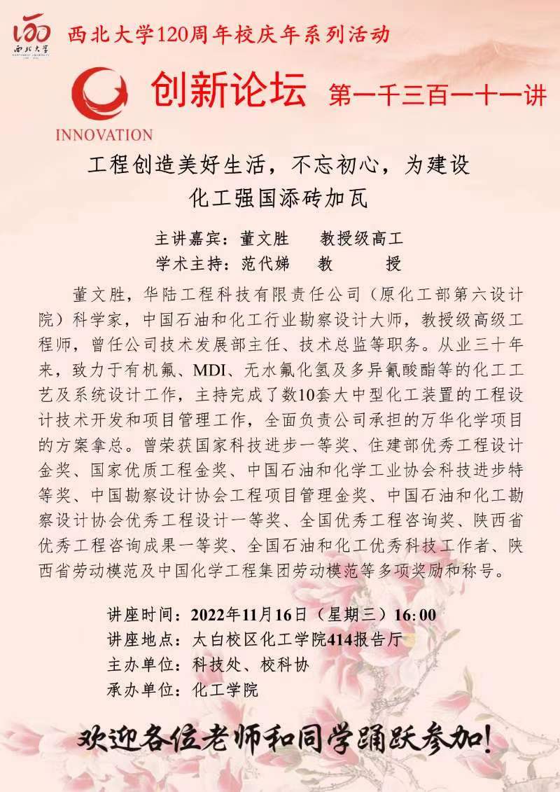 董文胜 教授级高工 开云网页版登录入口创新论坛第一千三百一十一讲暨120周年校庆年系列活动: 工程创造美好生活,不忘初心,为建设化工强国添砖加瓦 讲座时间 2022年11月16日(星期三)16:00 讲座地点 太白校区化工学院414报告厅 讲座人介绍 董文胜 教授级高工 讲座内容