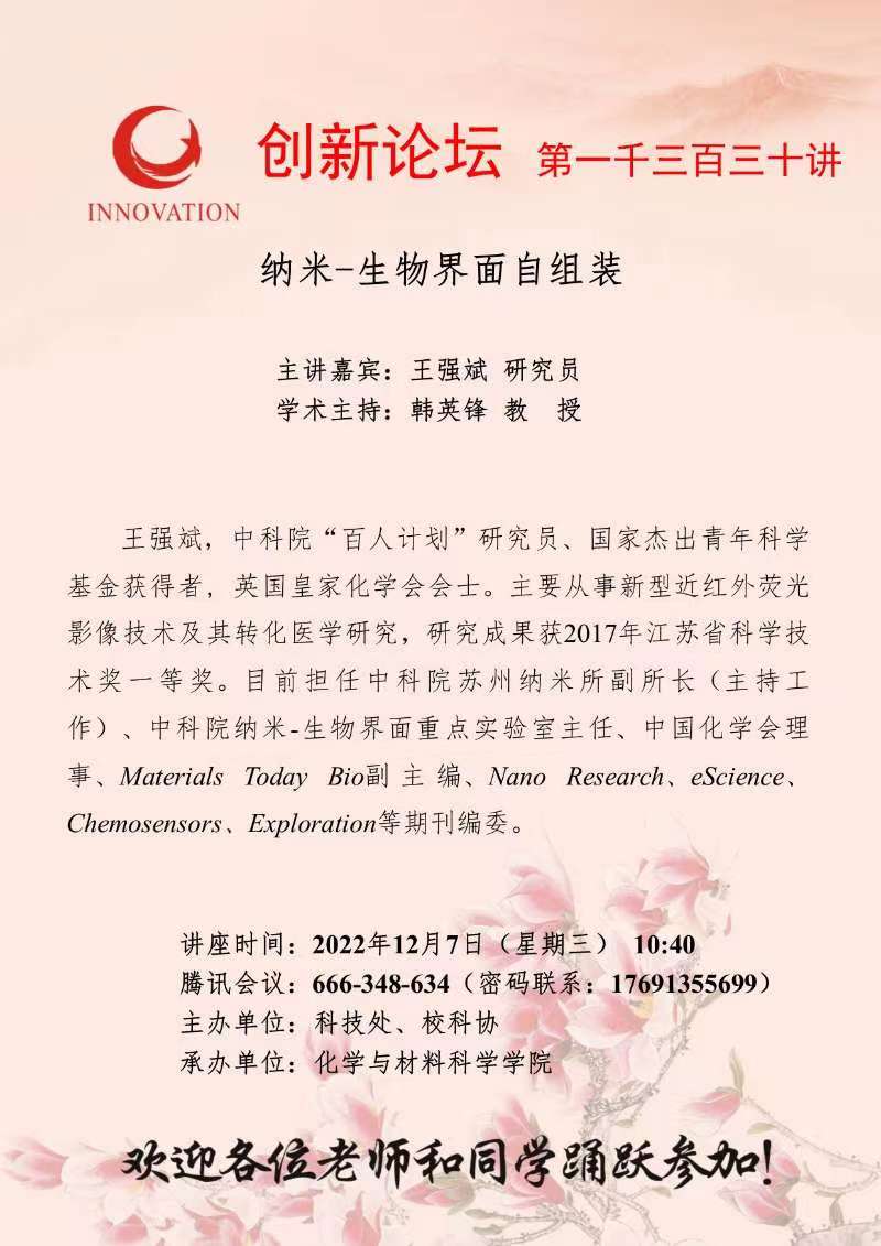 王强斌 研究员 开云网页版登录入口创新论坛第一千三百三十讲:纳米-生物界面自组装 讲座时间 2022年12月7日(星期三) 10:40 讲座地点 腾讯会议:666-348-634 讲座人介绍 王强斌 研究员 讲座内容