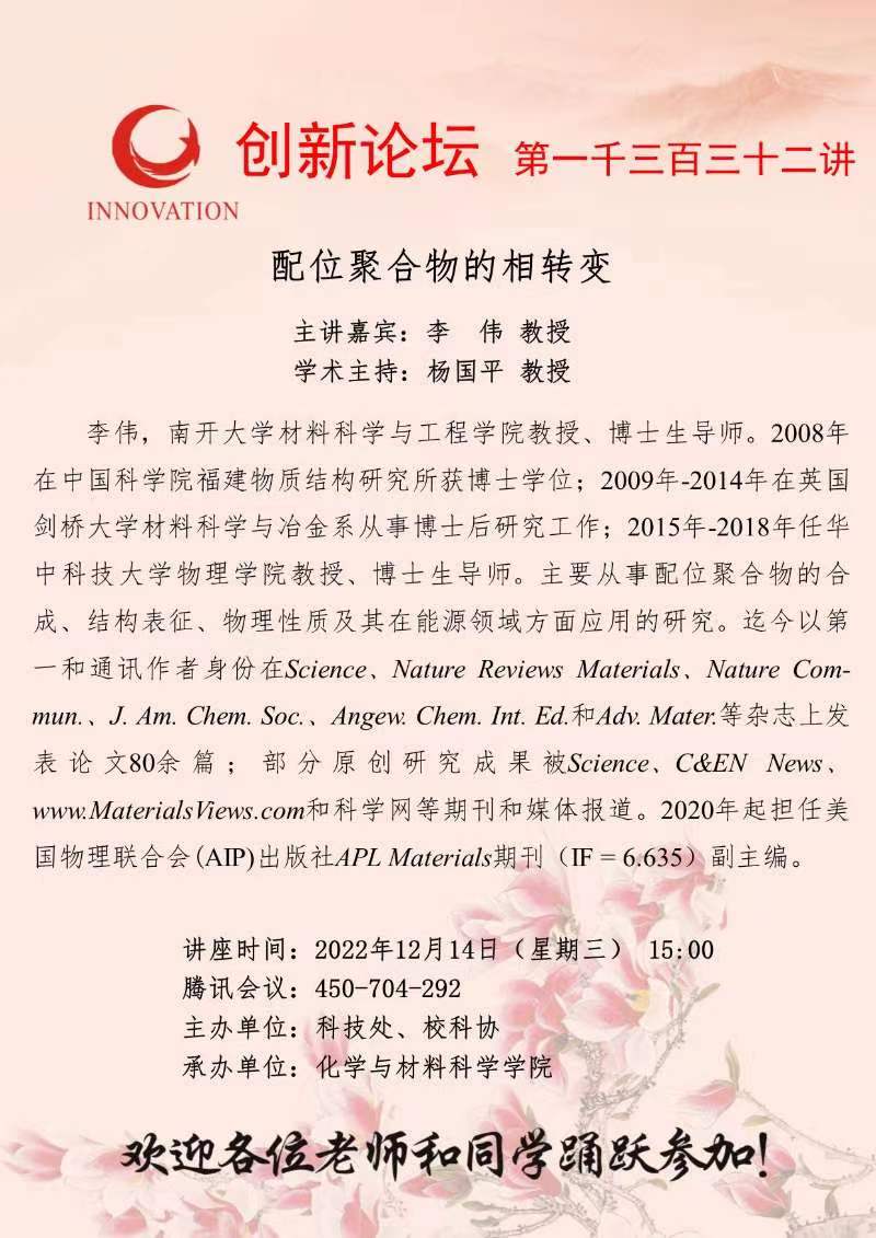 李伟 教授 开云网页版登录入口创新论坛第一千三百三十二讲:配位聚合物的相转变 讲座时间 2022年12月14日(星期三) 15:00 讲座地点 腾讯会议:450-704-292 讲座人介绍 李伟 教授 讲座内容