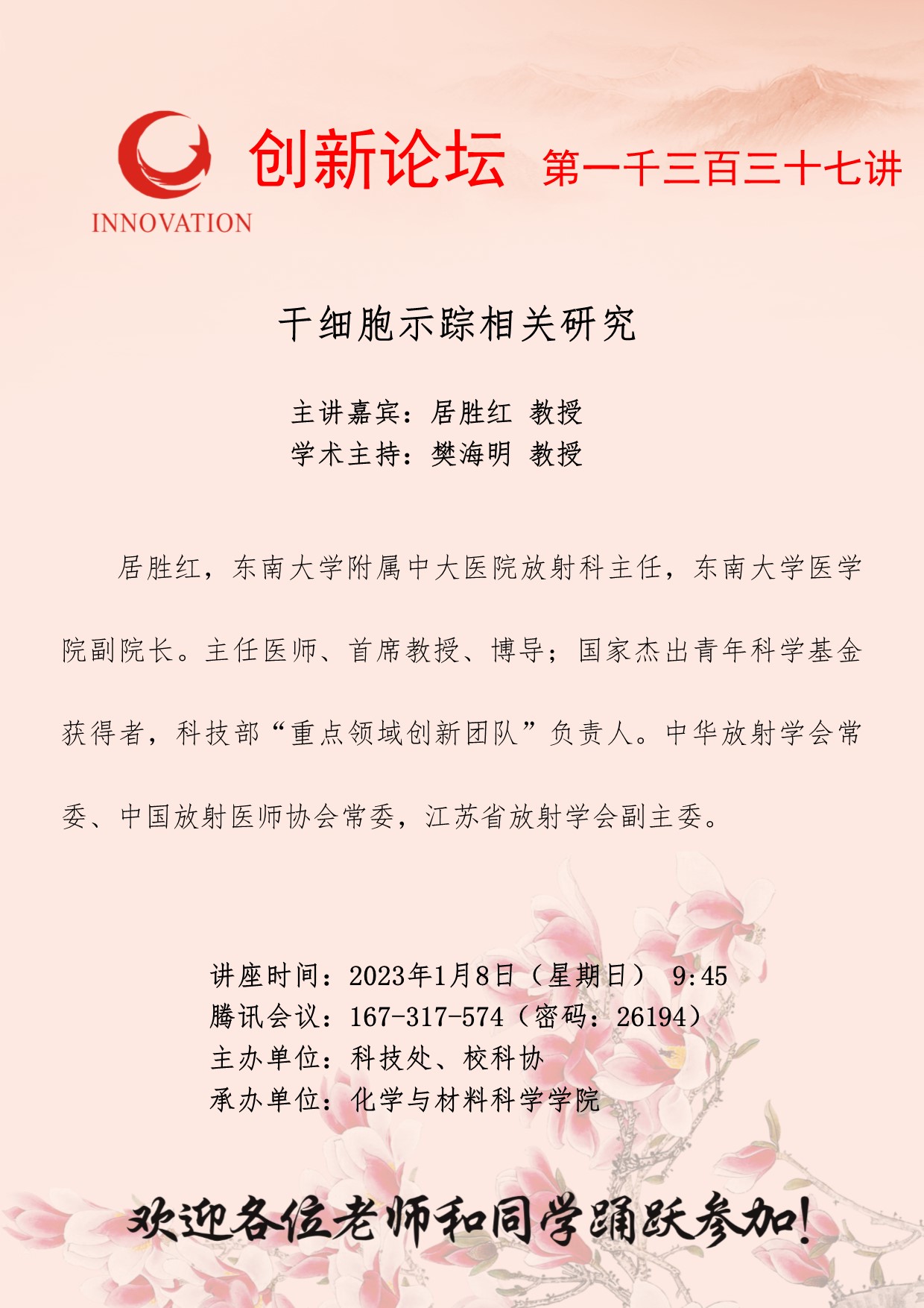 居胜红 教授 开云网页版登录入口创新论坛第一千三百三十七讲:干细胞示踪相关研究 讲座时间 2023年1月8日(星期日) 9:45 讲座地点 腾讯会议:167-317-574 讲座人介绍 居胜红 教授 讲座内容