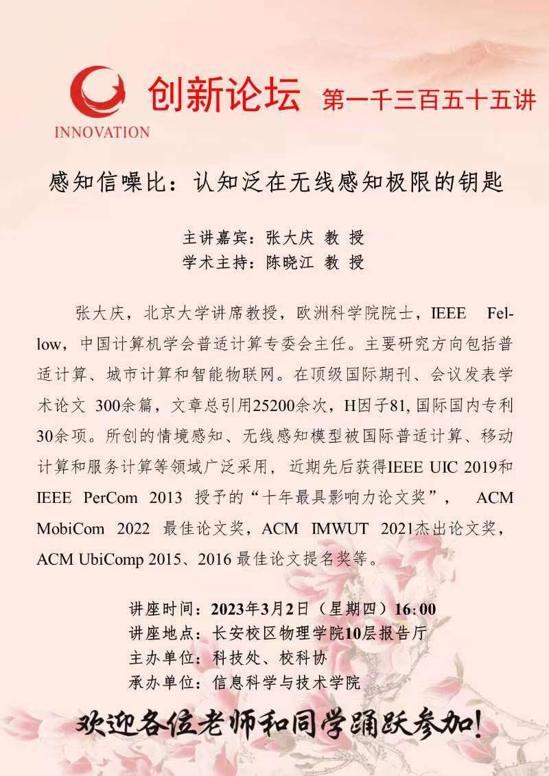 张大庆 教授 开云网页版登录入口创新论坛第一千三百五十五讲:感知信噪比:认知泛在无线感知极限的钥匙 讲座时间 2023年3月2日(星期四)16:00 讲座地点 长安校区物理学院10层报告厅 讲座人介绍 张大庆 教授 讲座内容