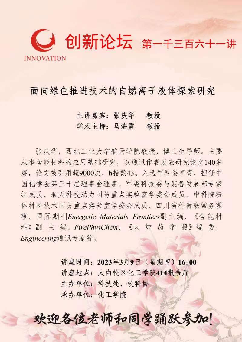 张庆华 教授 开云网页版登录入口创新论坛第一千三百六十一讲:面向绿色推进技术的自燃离子液体探索研究 讲座时间 2023年3月9日(星期四)16:00 讲座地点 太白校区化工学院414报告厅 讲座人介绍 张庆华 教授 讲座内容