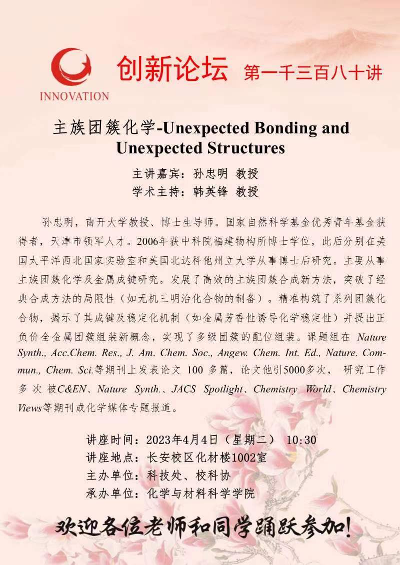 孙忠明 教授 开云网页版登录入口创新论坛第一千三百八十讲:主族团簇化学-Unexpected Bonding and Unexpected Structures 讲座时间 2023年4月4日(星期二) 10:30 讲座地点 长安校区化材楼1002室 讲座人介绍 孙忠明 教授 讲座内容