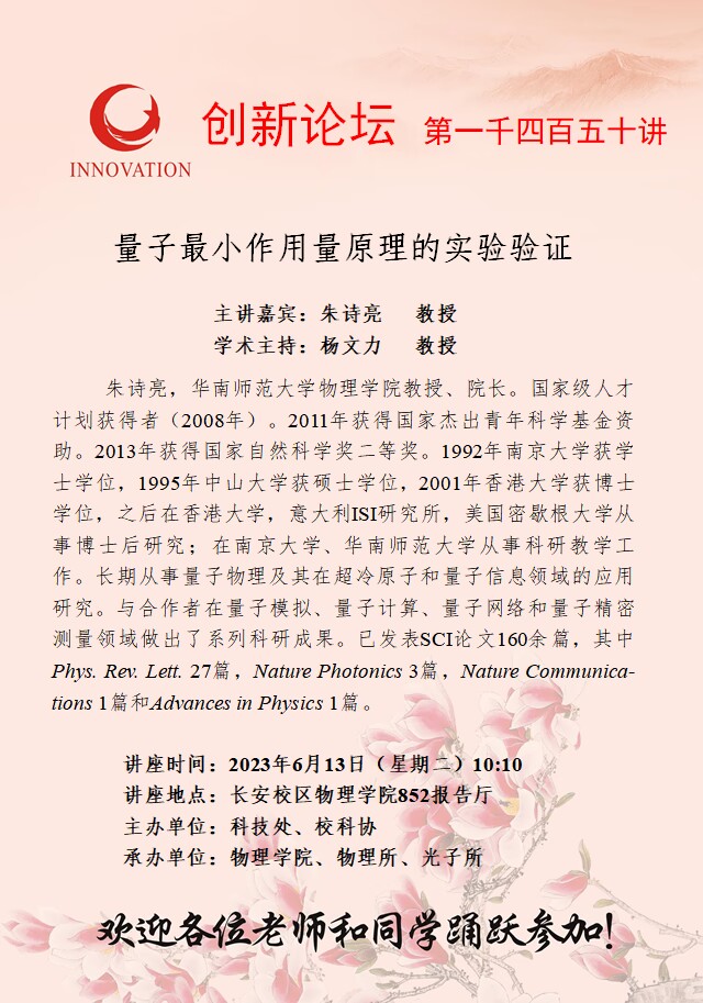 朱诗亮 教授 开云网页版登录入口创新论坛第一千四百五十讲:量子最小作用量原理的实验验证 讲座时间 2023年6月13日(星期二)10:10 讲座地点 长安校区物理学院852报告厅 讲座人介绍 朱诗亮 教授 讲座内容