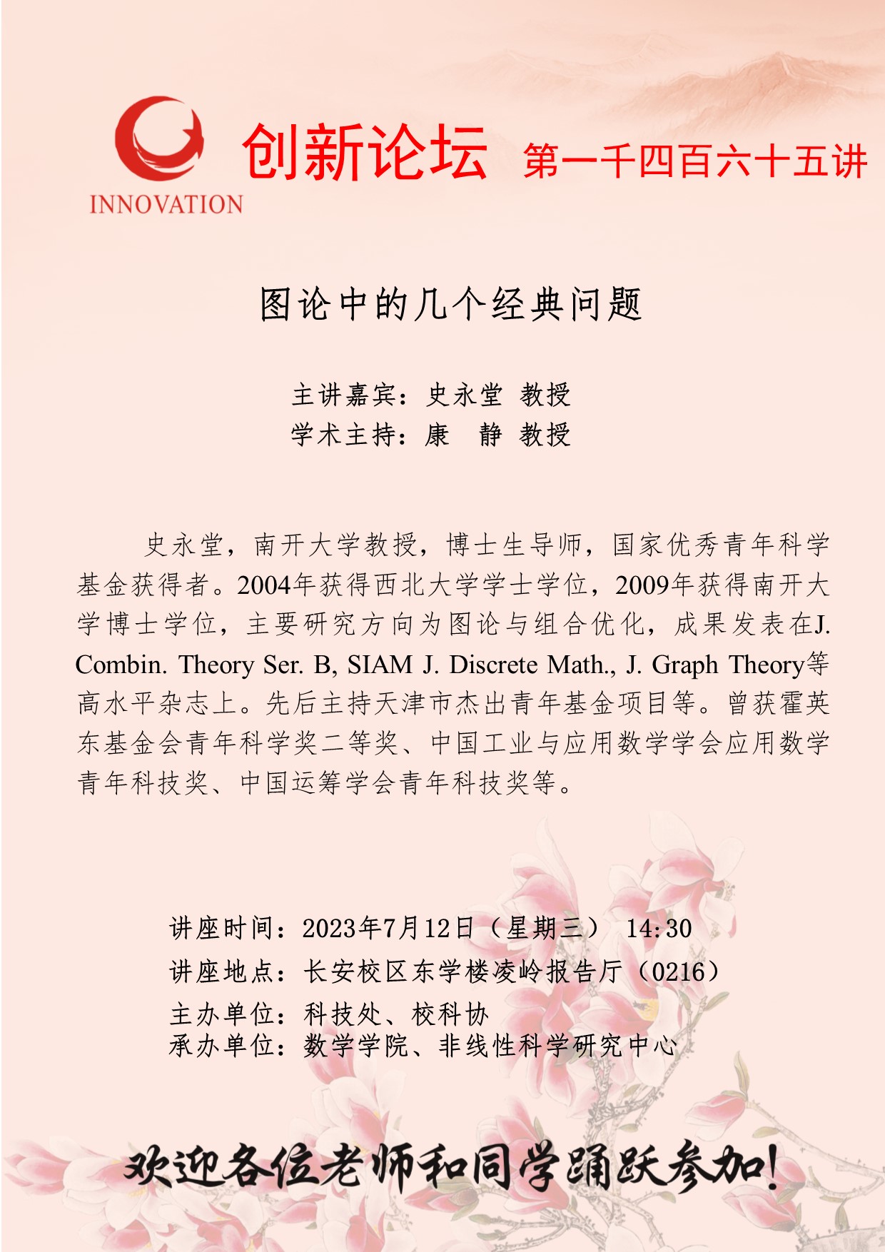 史永堂 教授 开云网页版登录入口创新论坛第一千四百六十五讲: 图论中的几个经典问题 讲座时间 2023年7月12日(星期三) 14:30 讲座地点 长安校区东学楼凌岭报告厅(0216) 讲座人介绍 史永堂 教授 讲座内容