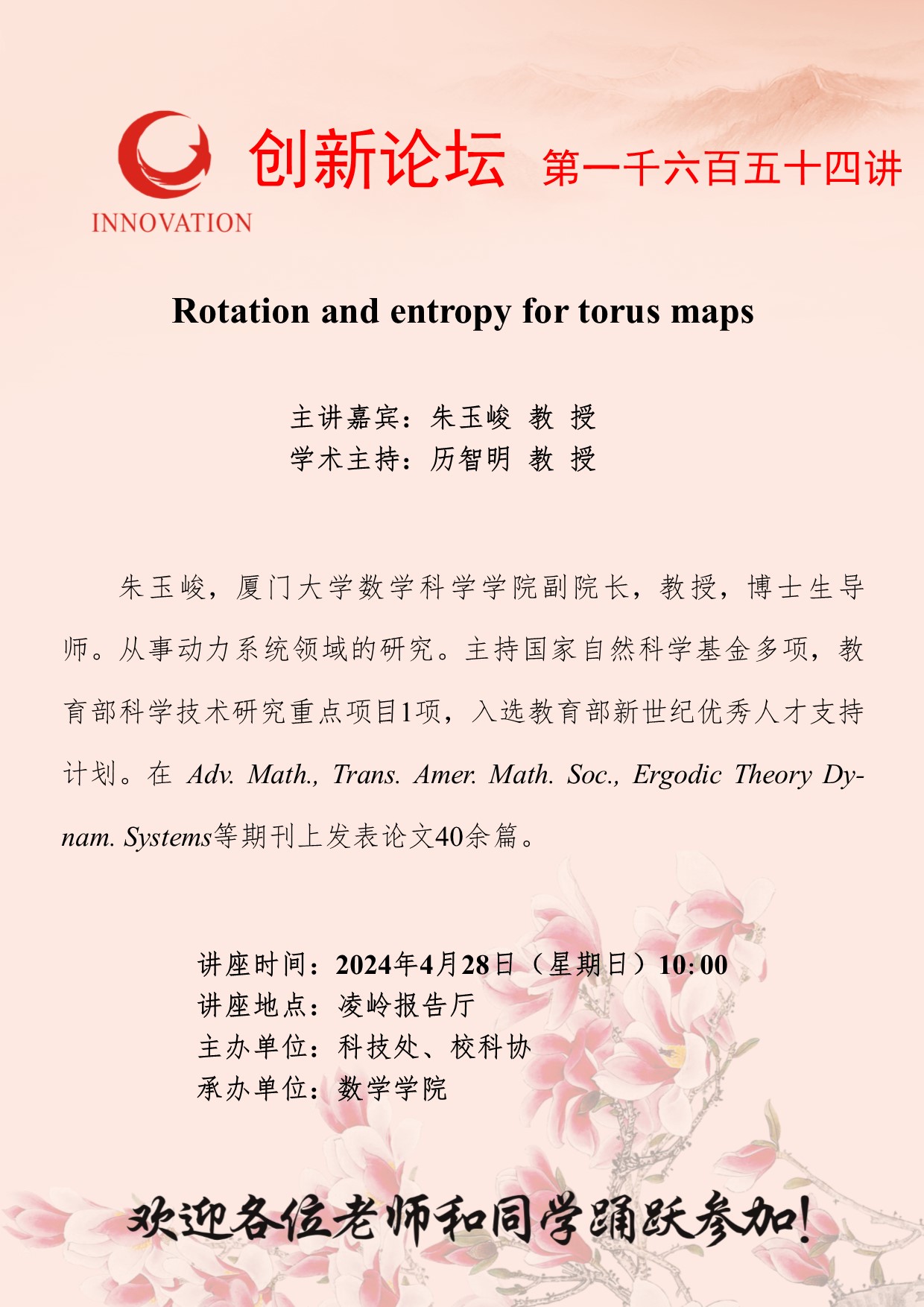 朱玉峻 教授 开云网页版登录入口创新论坛第一千六百五十四讲:Rotation and entropy for torus maps 讲座时间 2024年4月28日(星期日)10:00 讲座地点 凌岭报告厅 讲座人介绍 朱玉峻 教授 讲座内容