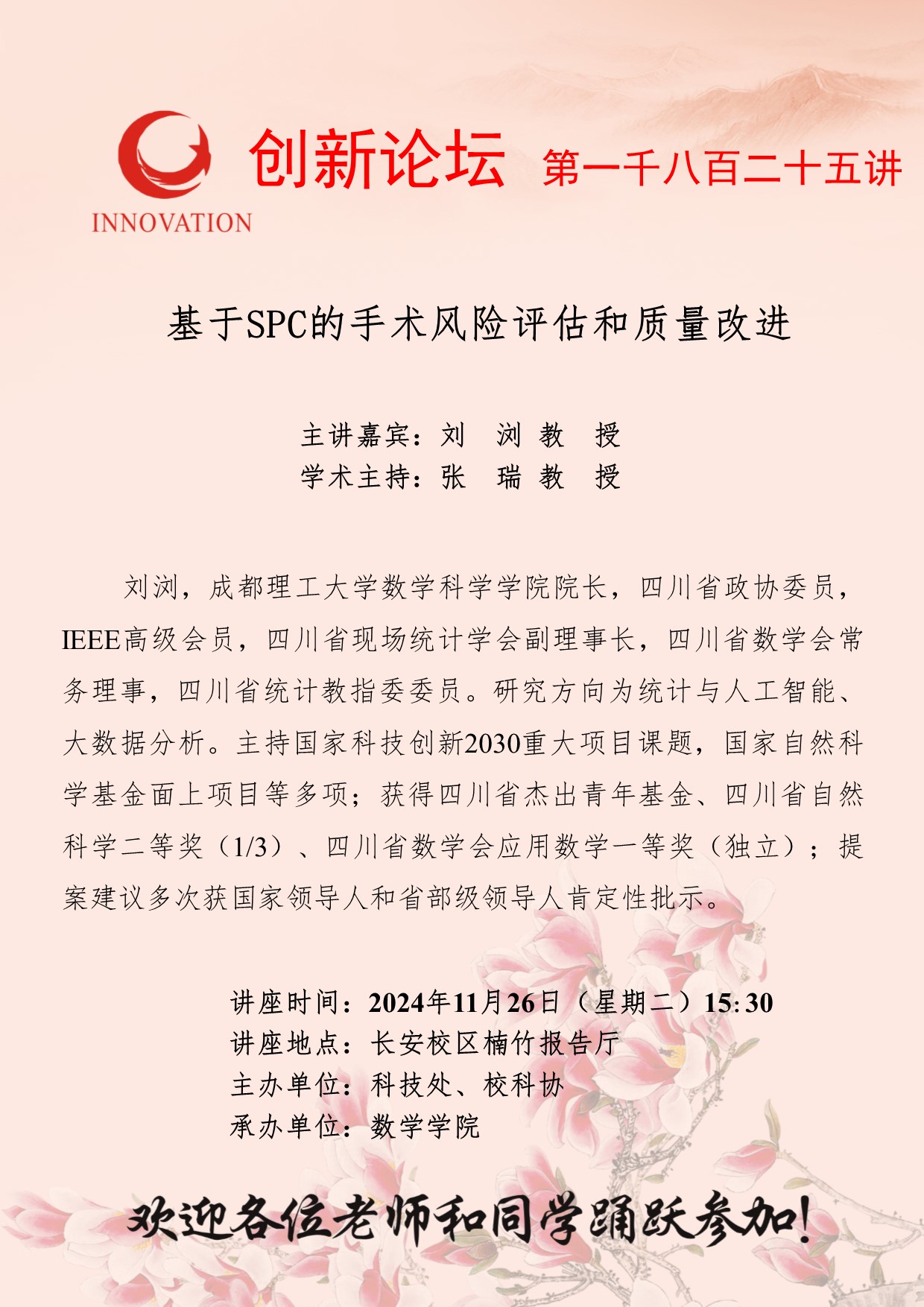 刘浏 教授 开云网页版登录入口创新论坛第一千八百二十五讲:基于SPC的手术风险评估和质量改进 讲座时间 2024年11月26日(星期二)15:30 讲座地点 长安校区楠竹报告厅 讲座人介绍 刘浏 教授 讲座内容