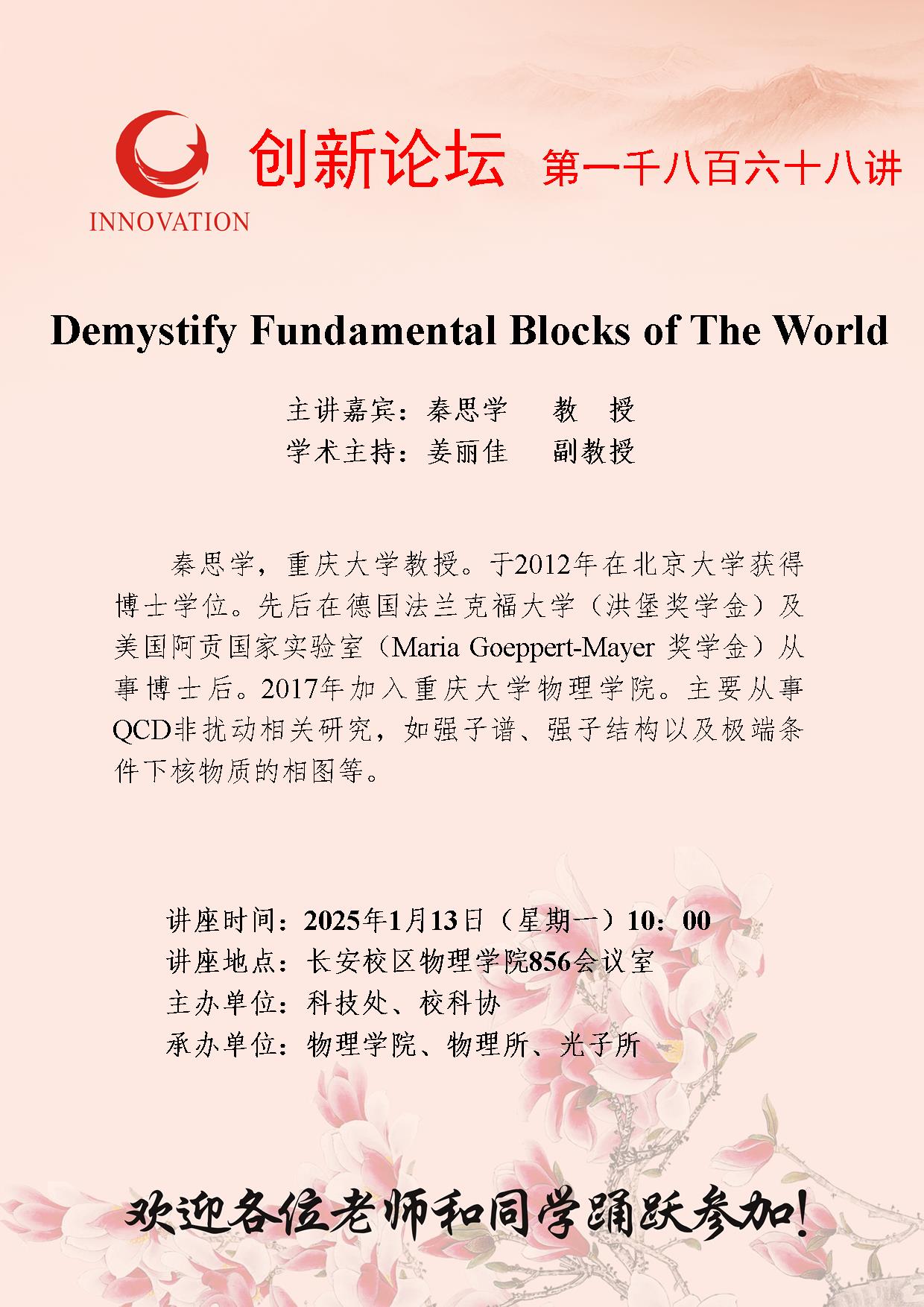 秦思学 教授 开云网页版登录入口创新论坛第一千八百六十八讲:Demystify Fundamental Blocks of The World 讲座时间 2025年1月13日(星期一)10:00 讲座地点 长安校区物理学院856会议室 讲座人介绍 秦思学 教授 讲座内容