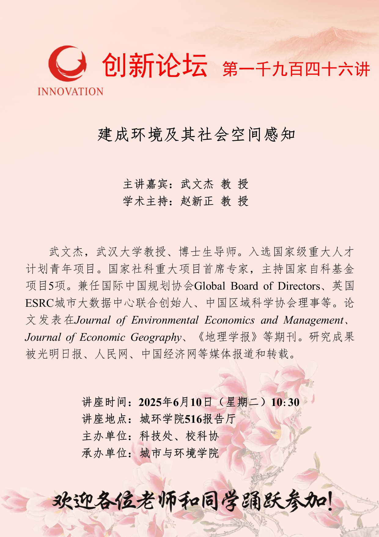 武文杰 教授 开云网页版登录入口创新论坛第一千九百四十六讲:建成环境及其社会空间感知 讲座时间 2025年6月10日(星期二)10:30 讲座地点 城环学院516报告厅 讲座人介绍 武文杰 教授 讲座内容