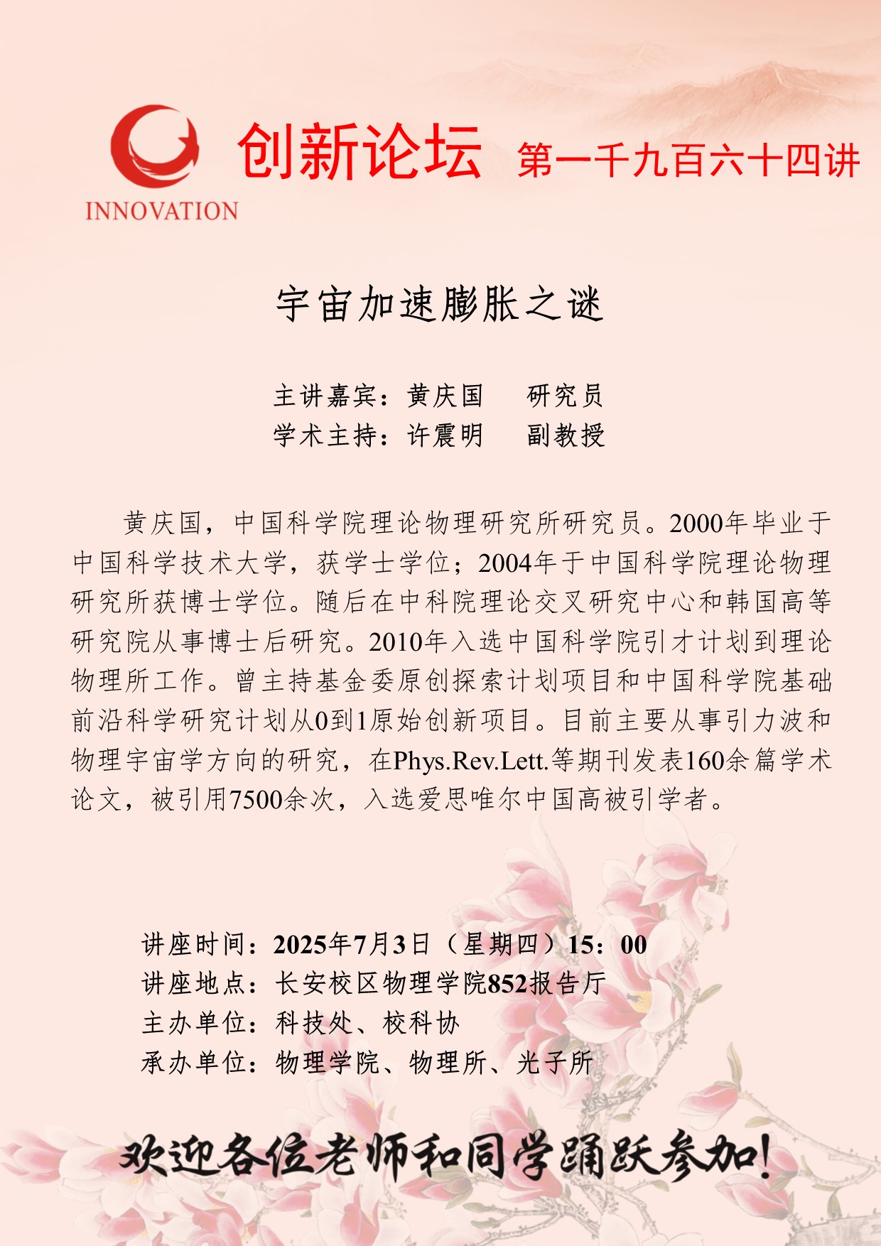 黄庆国 研究员 开云网页版登录入口创新论坛第一千九百六十四讲:宇宙加速膨胀之谜 讲座时间 2025年7月3日(星期四)15:00 讲座地点 长安校区物理学院852报告厅 讲座人介绍 黄庆国 研究员 讲座内容