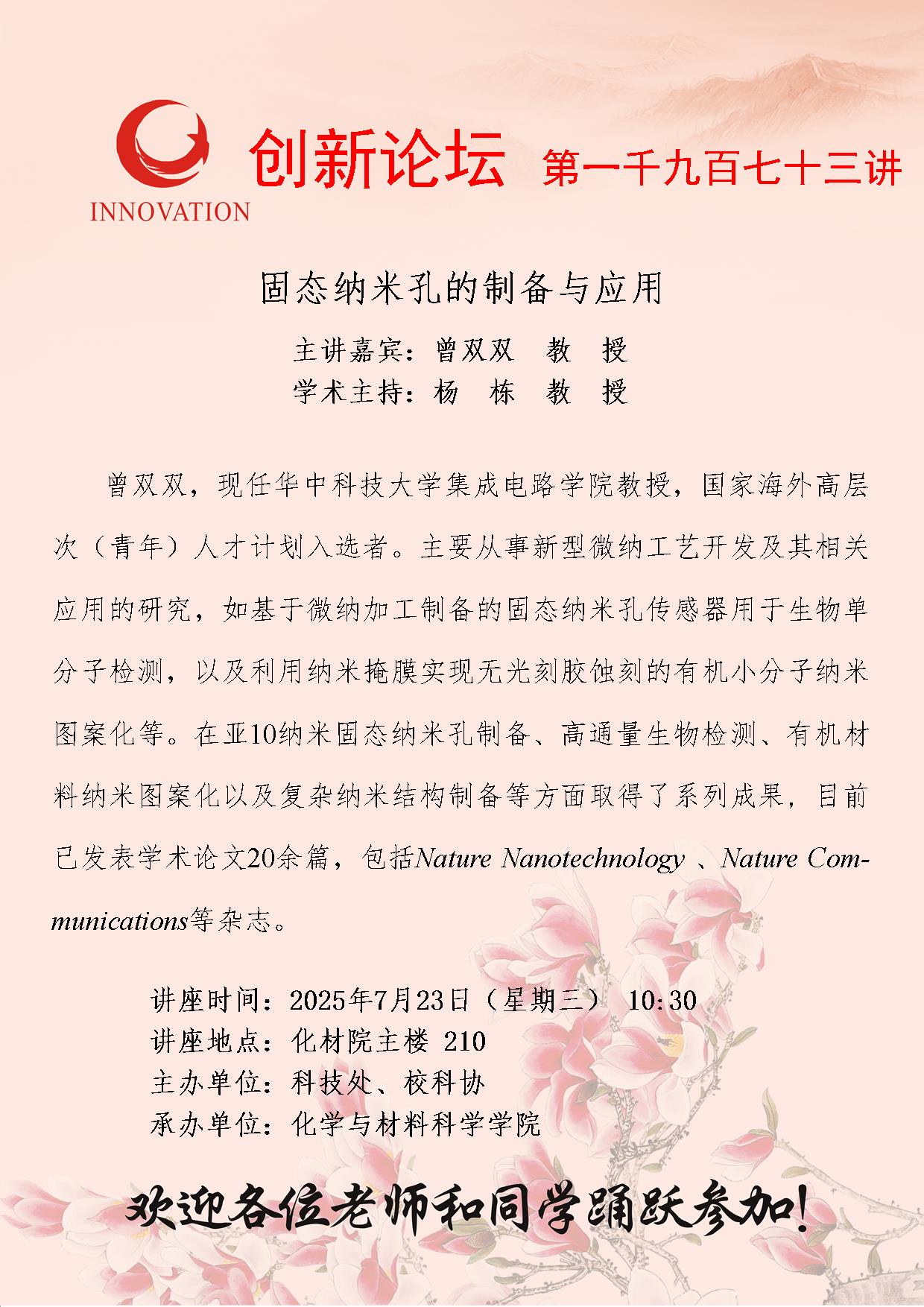 曾双双 教授 开云网页版登录入口创新论坛第一千九百七十三讲:固态纳米孔的制备与应用 讲座时间 2025年7月23日(星期三) 10:30 讲座地点 化材院主楼 210 讲座人介绍 曾双双 教授 讲座内容