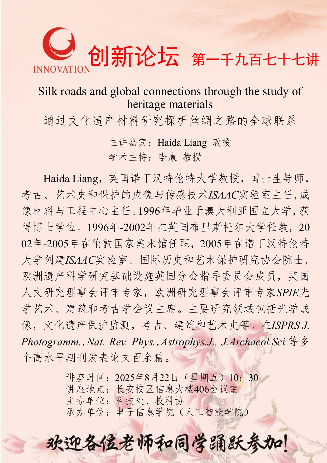 梁海达 教授 开云网页版登录入口创新论坛第一千九百七十七讲:Silk roads and global connections through the study of heritage materials 讲座时间 2025年8月22日(星期五)10:30 讲座地点 长安校区信息大楼406会议室 讲座人介绍 梁海达 教授 讲座内容
